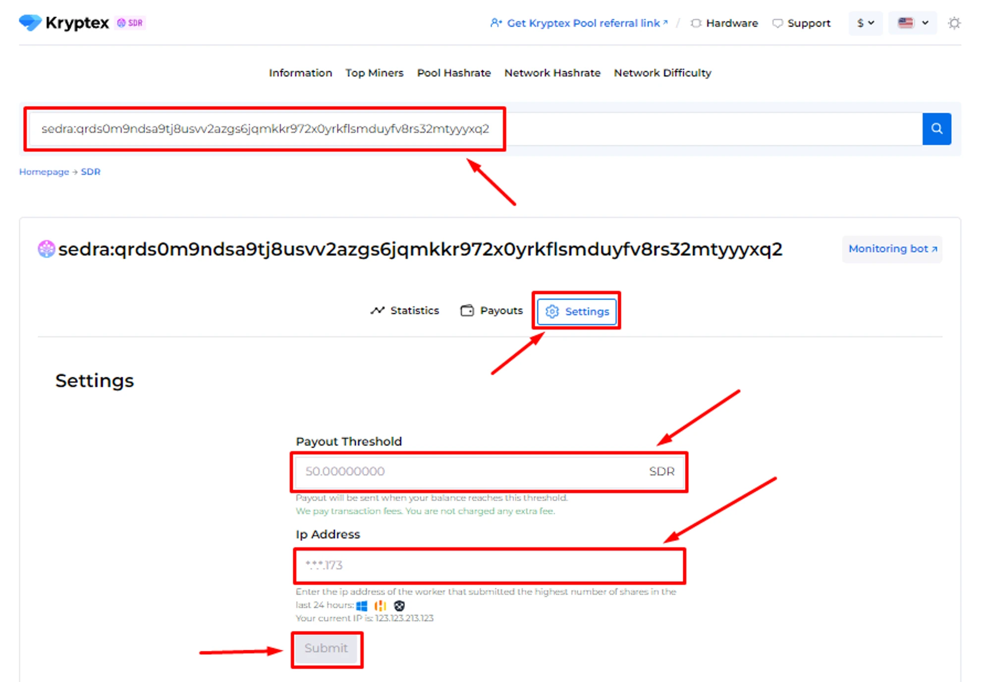 Set the desired “Payment Threshold”. Minimum and maximum payment threshold mentioned at the pool home page. There is no payout fee — Kryptex pays it for you 🖤