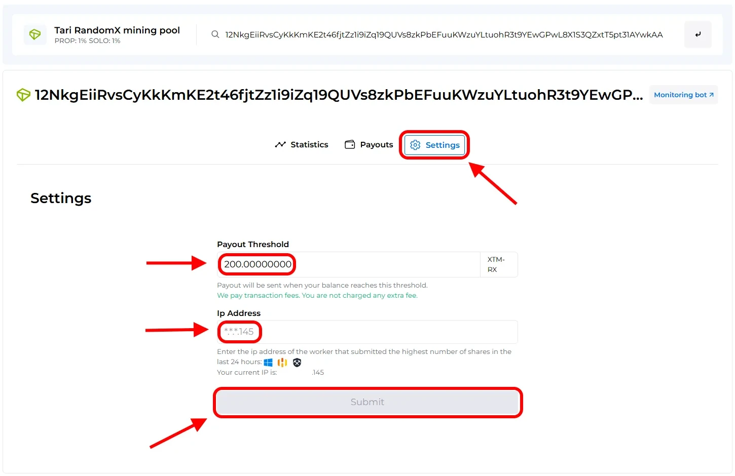 In the “Wallet address” field, enter the wallet address that you registered earlier. Wallet address example: