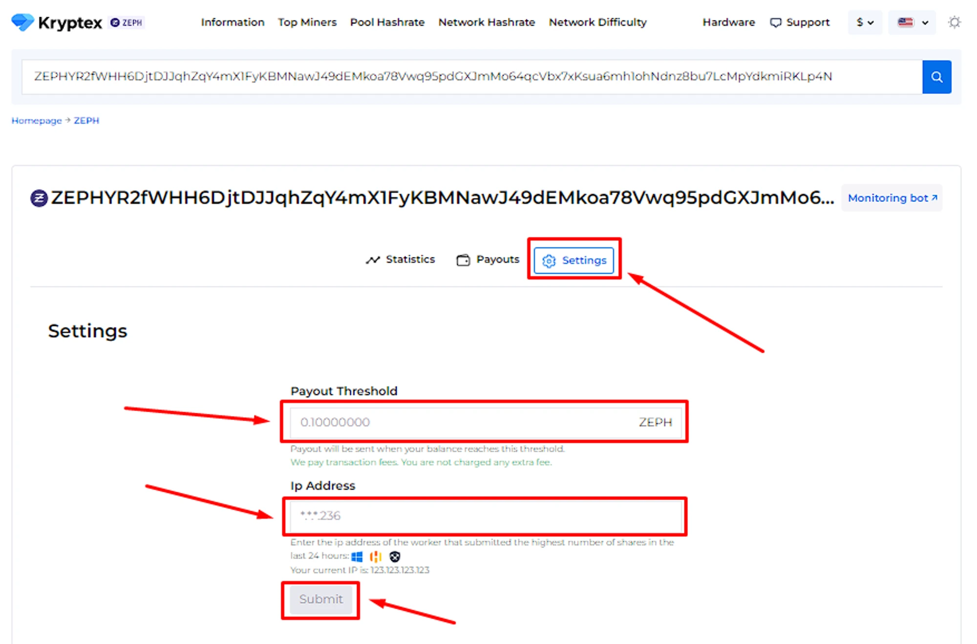 Set the desired “Payment Threshold”. Minimum and maximum payment threshold mentioned at the pool home page. There is no payout fee — Kryptex pays it for you 🖤