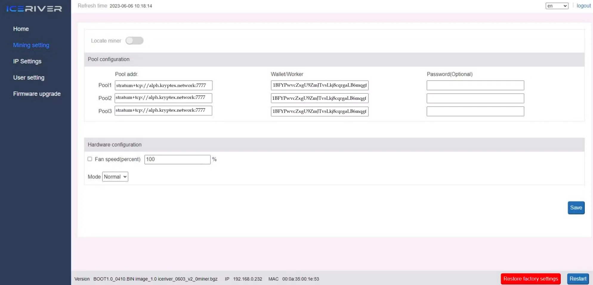 Click “Save” to save the settings, and then click “Restart” to restart the ASIC.