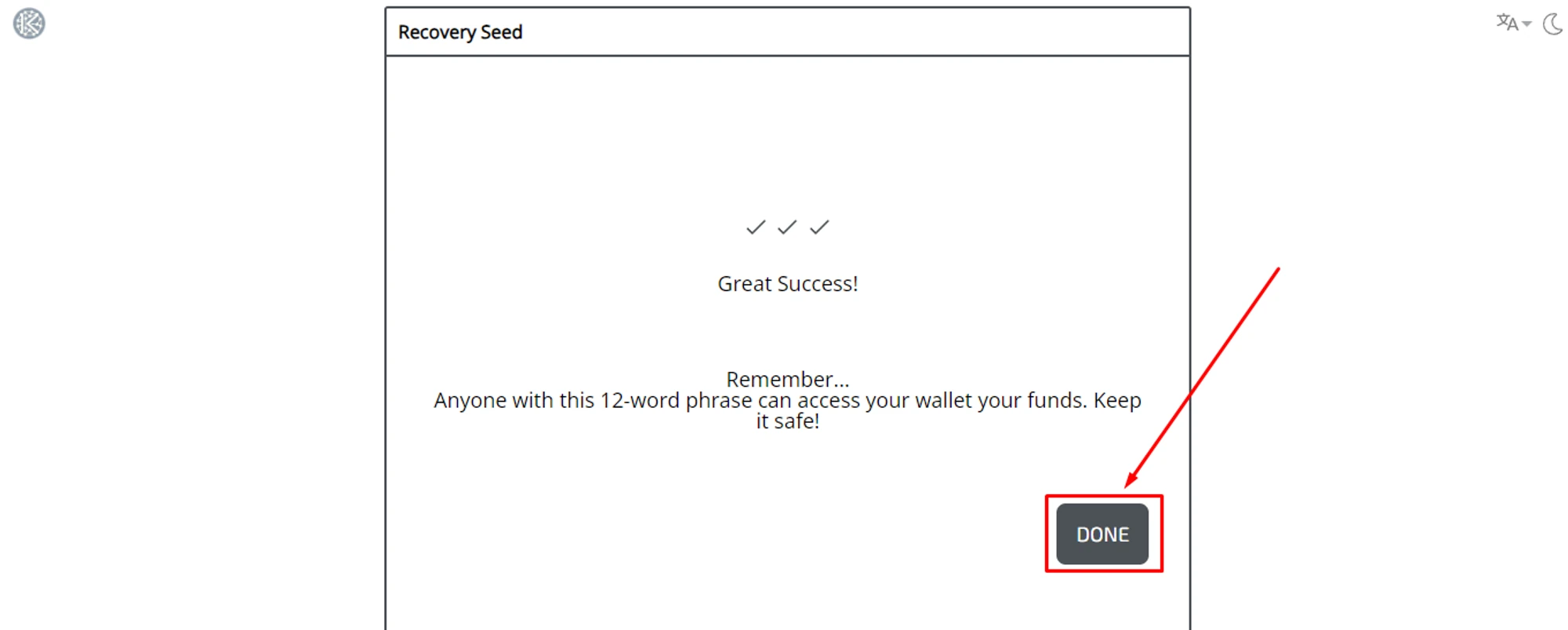 After successful verification, the wallet will remind you of the security rules. The one who owns the seed phrase of 12 words — owns the wallet! Acknowledge it, and move on to the wallet. Click the "Done" button.