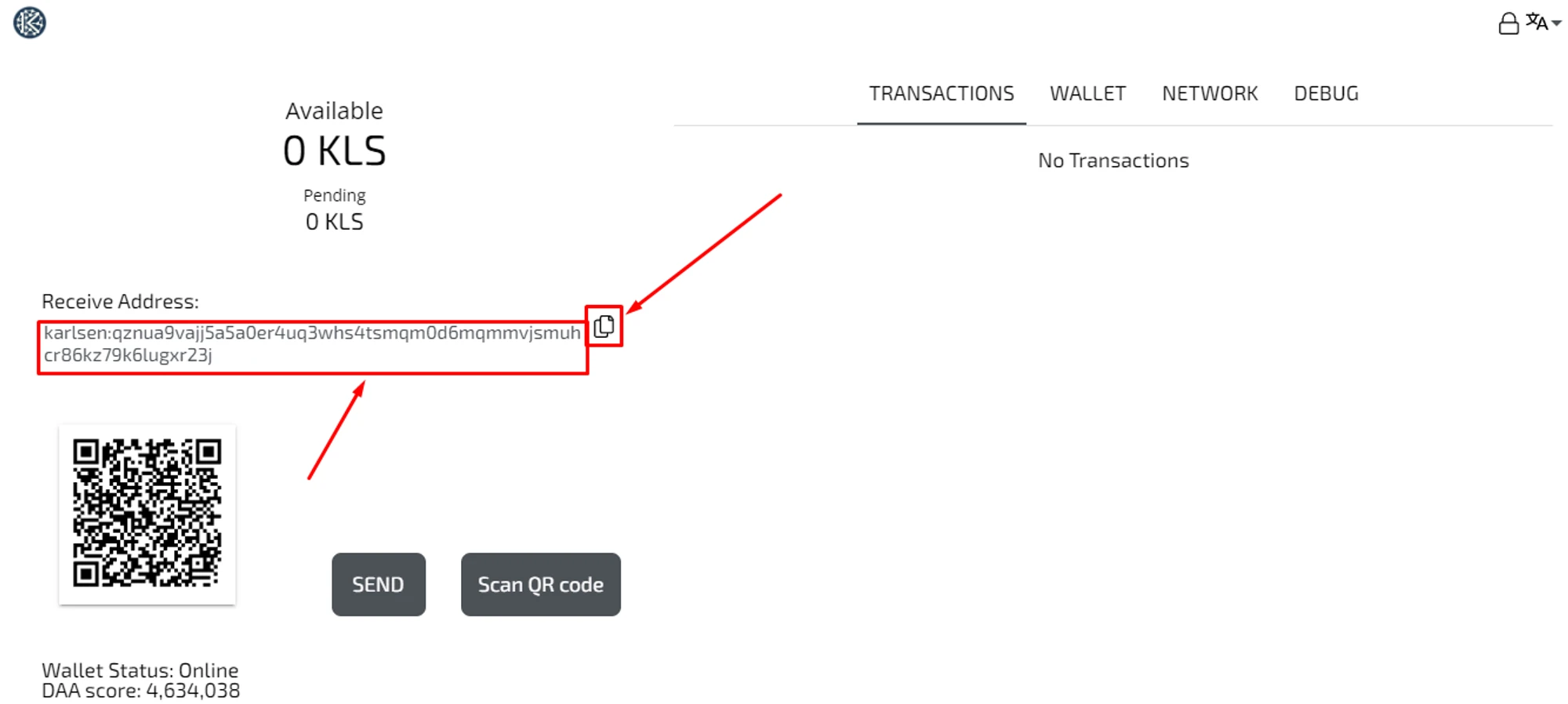 Done! You have received your Karlsen wallet and can use it for mining and sending transactions.