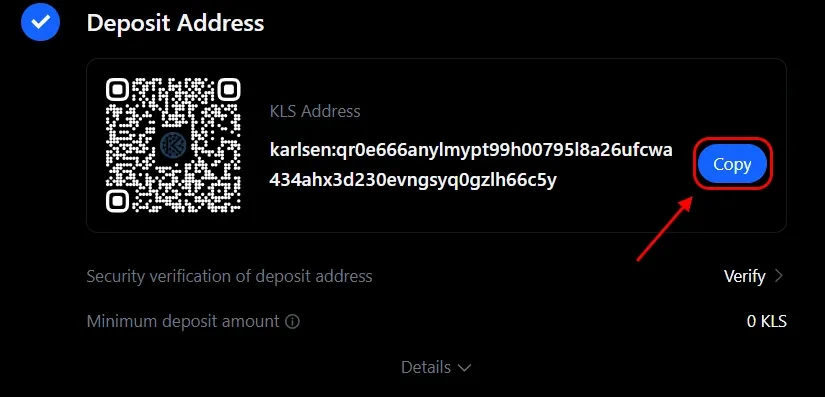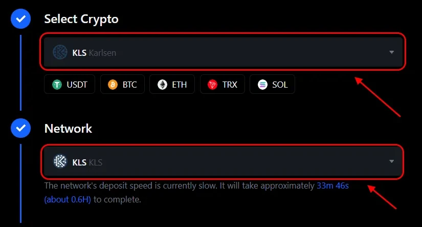 You will be taken to the deposit page. From the list of coins, select “KLS”, and from the list of networks, choose “KLS.”