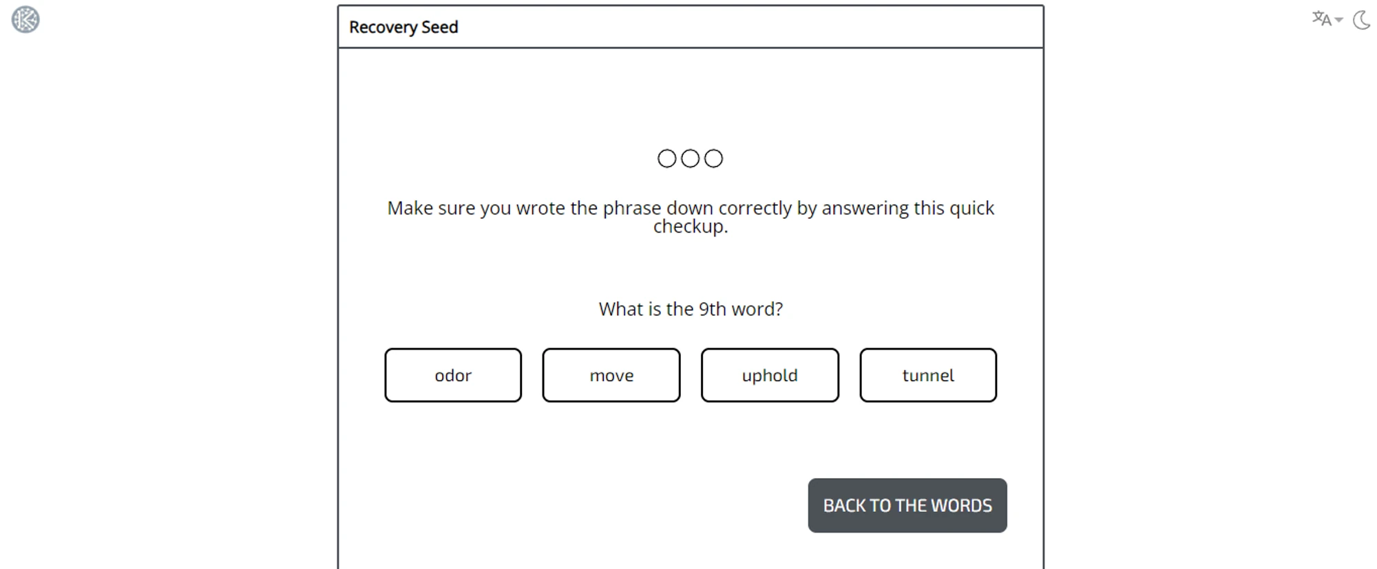 The wallet will check how well you remember your seed phrase and word order. The dialog window will ask you to choose the correct word in the given order three times. If you forgot or didn’t write it down, the wallet will offer to return to word order and repeat the verification procedure.