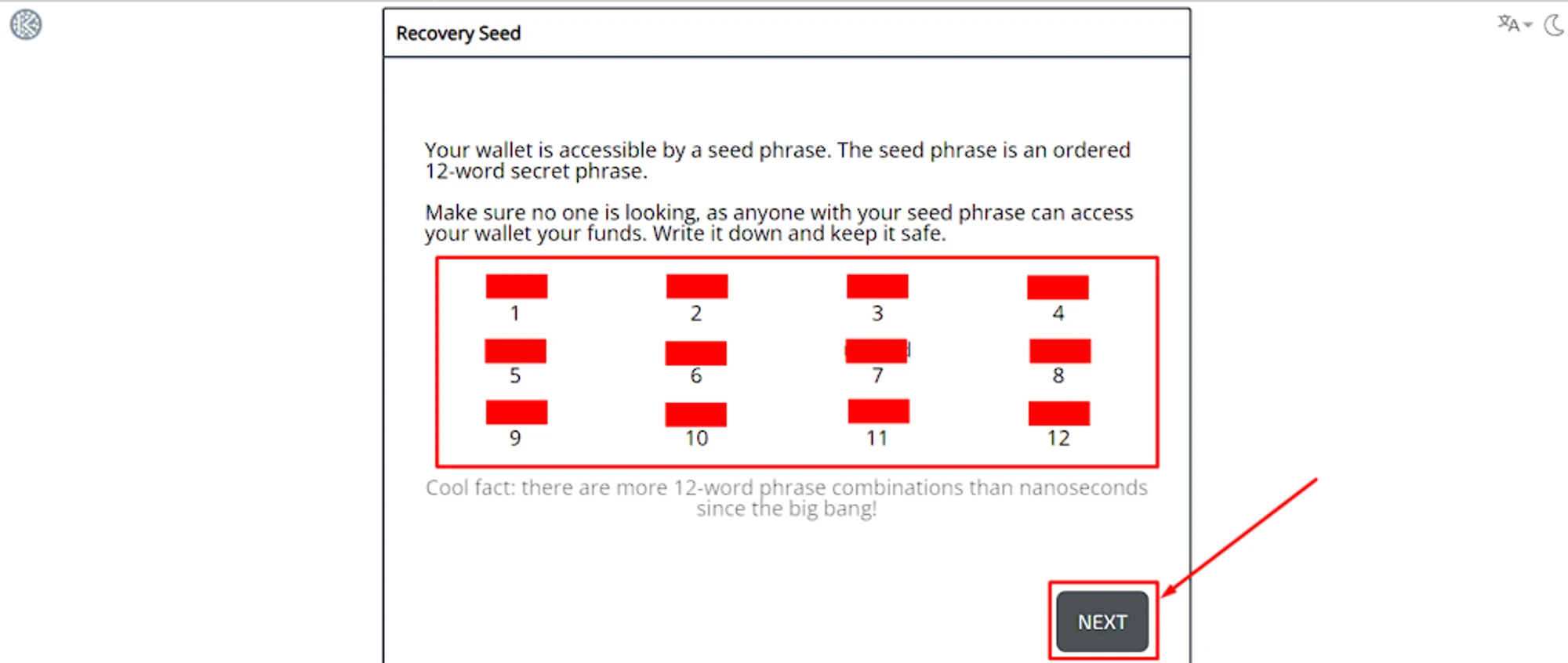 You will receive a secret phrase — a combination of 12 words. Safely keep them in the same order as they appear on your screen. Losing them means losing access to your wallet! Then click “Next”.
