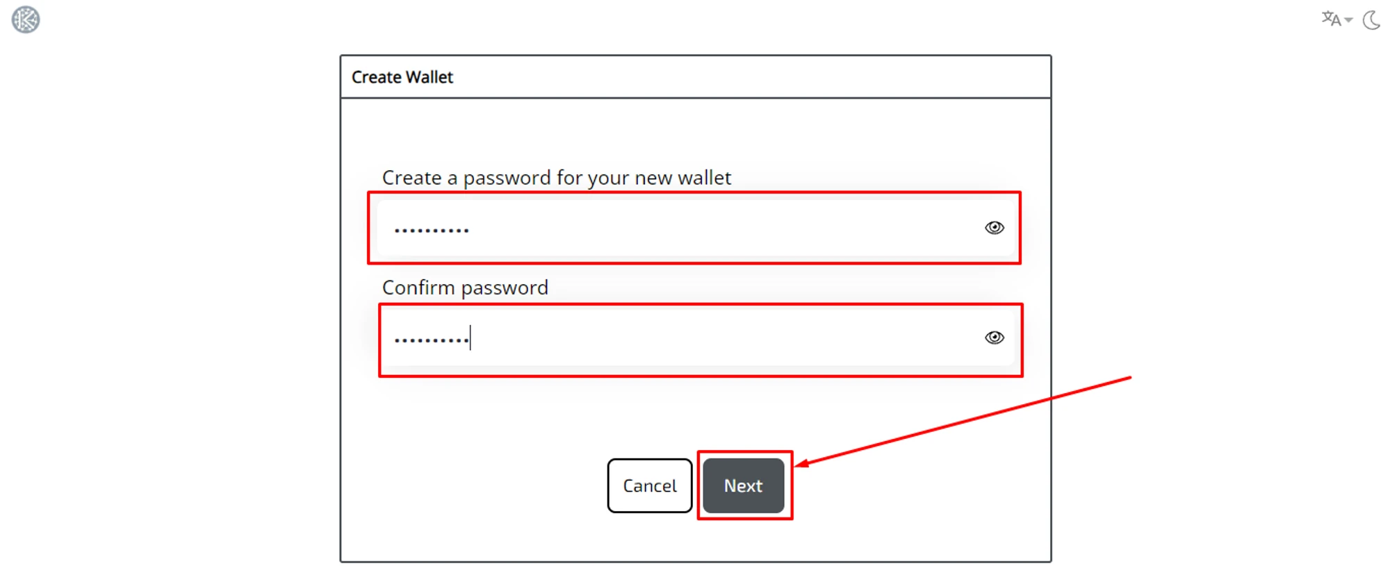 The wallet asks you to enter a password for your wallet and confirm it. Generate reliable password with your browser or use the password generator. Enter the password, confirm it, and click “Next”.