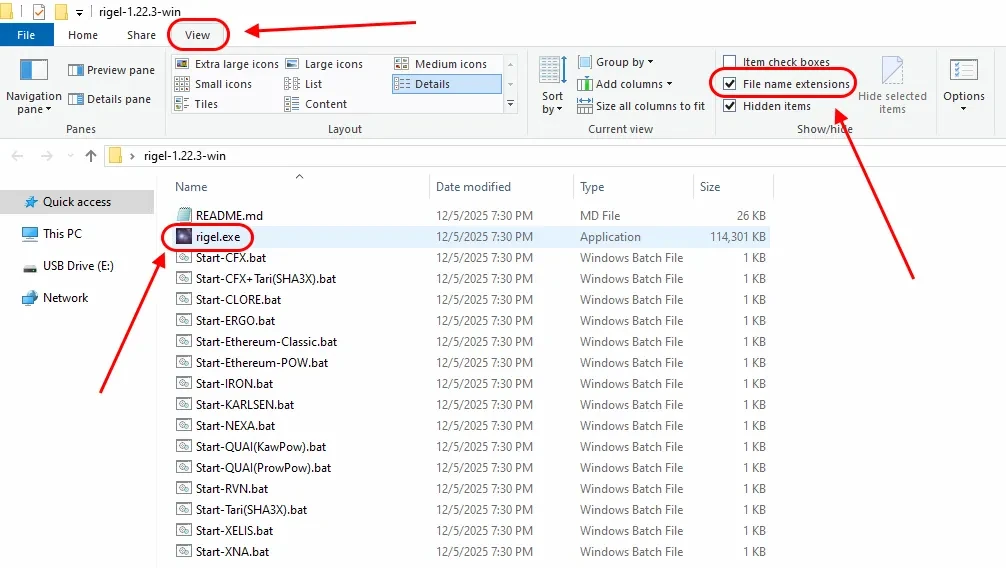 Open the folder with the miner, and turn on the display of file extensions: