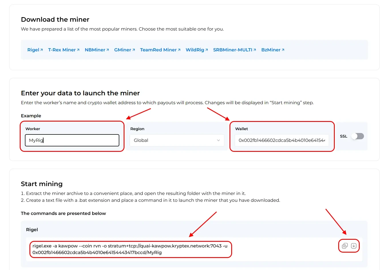 MyFirstRig. Please note that the name is entered only in Latin letters or numbers, without spaces.Copy the finished command from the cell “BAT file example” by pressing special “Copy” button.