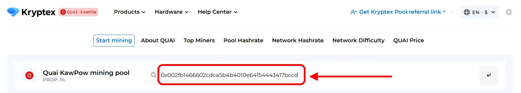 Open the Quai KawPow pool page — https://pool.kryptex.com/quai-kawpow
