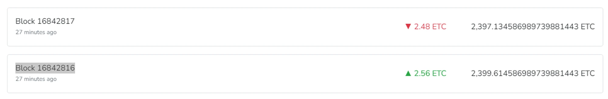 - Reward per block (at the time of writing) — 2.56 ETC + Uncle block reward. According to the ETC coin protocol, the block reward is reduced by 20% for every 5,000,000 blocks. As of this writing, the reward for an Uncle block is about 0.08 ETC.