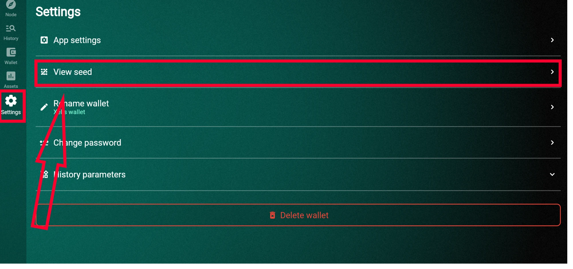 Once wallet created, go to the “Settings” section and click on the “View seed” button. Enter the password for the wallet that you came up with.