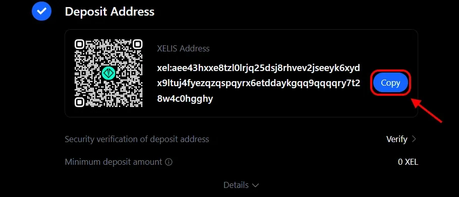 You will be taken to the deposit page. From the list of coins, select “XEL”, and from the list of networks, choose “XELIS.”