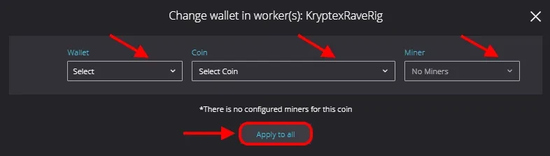 Нажмите кнопку “Apply to all”. Если всё получилось, ваш воркер появится в личном кабинете Криптекса в разделе “Воркеры на пуле” в течение пары минут.