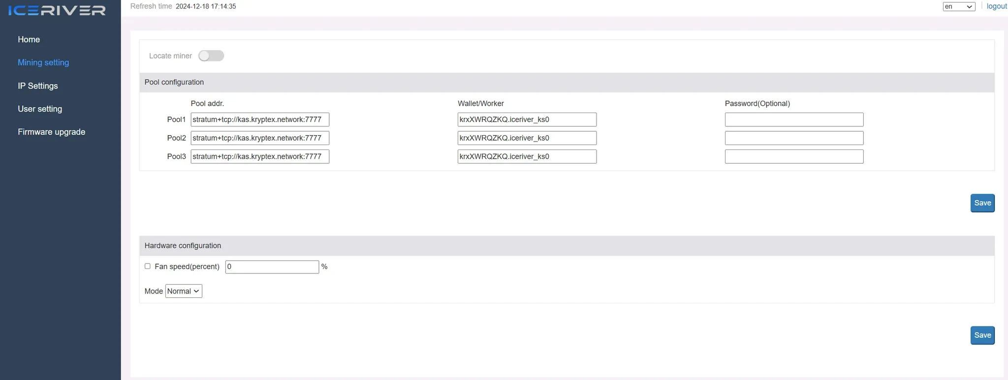 Нажмите “Setup Miner Config” для редактирования настроек майнера.