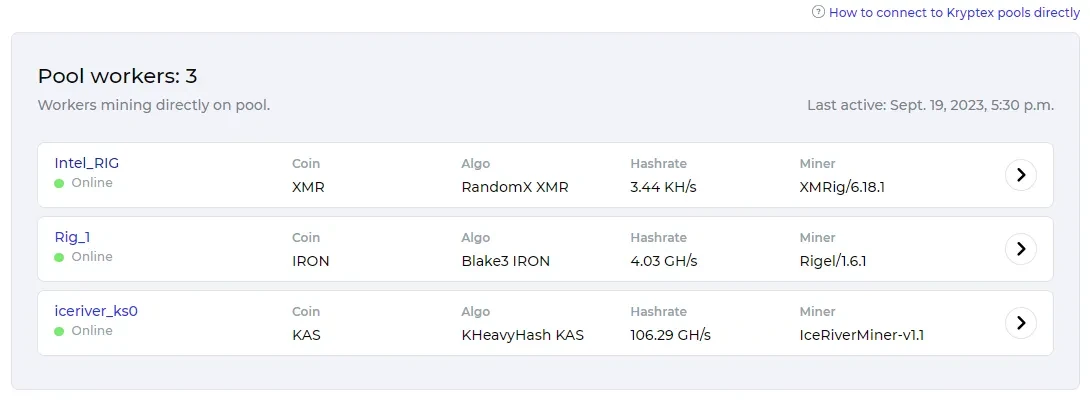 Начните майнить, и ваш воркер появится личном кабинете Криптекса в разделе “Воркеры на пуле” в течение пары минут.