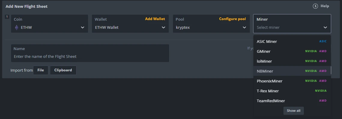 If the miner you need is not listed, click the “Show all” button and select the miner you need. In this case, you will need to configure it manually.