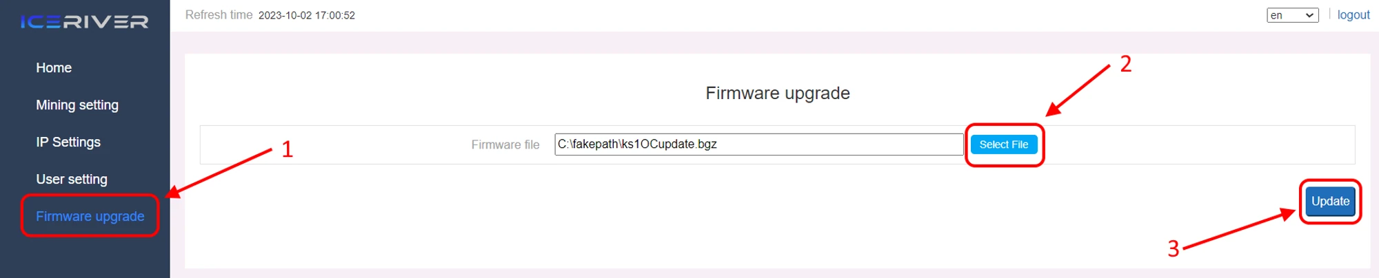 Select File”, select the downloaded40KS1update.bgzfile on your PC, and click the “Update” button.