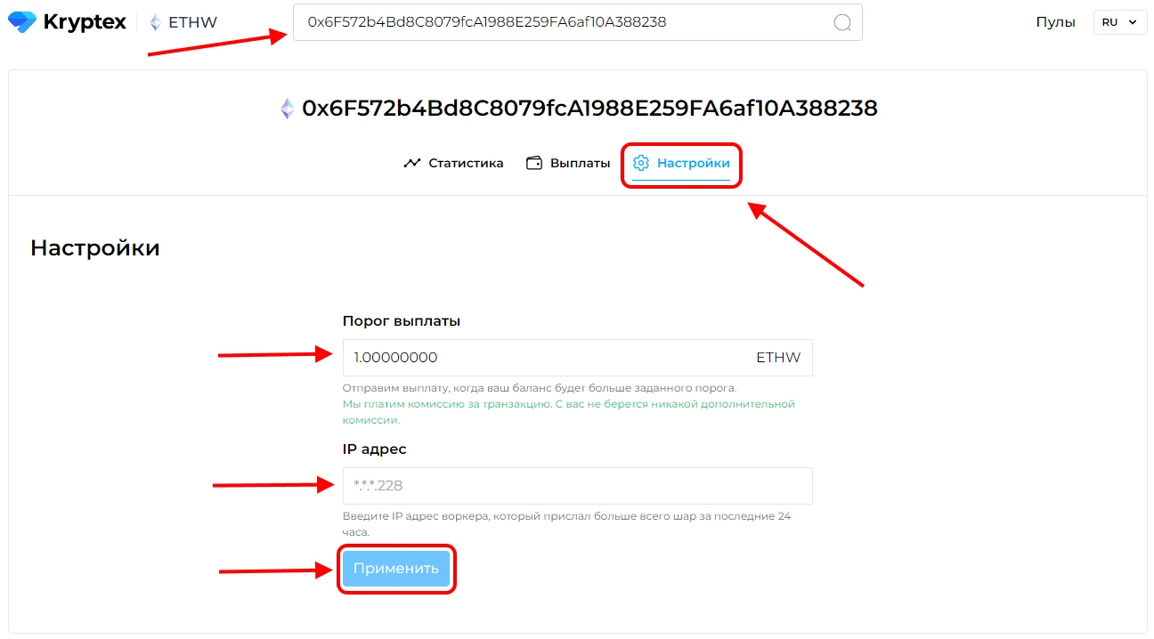 | ETHW | Кошелек ETHW | ethw.kryptex.network:7034 |