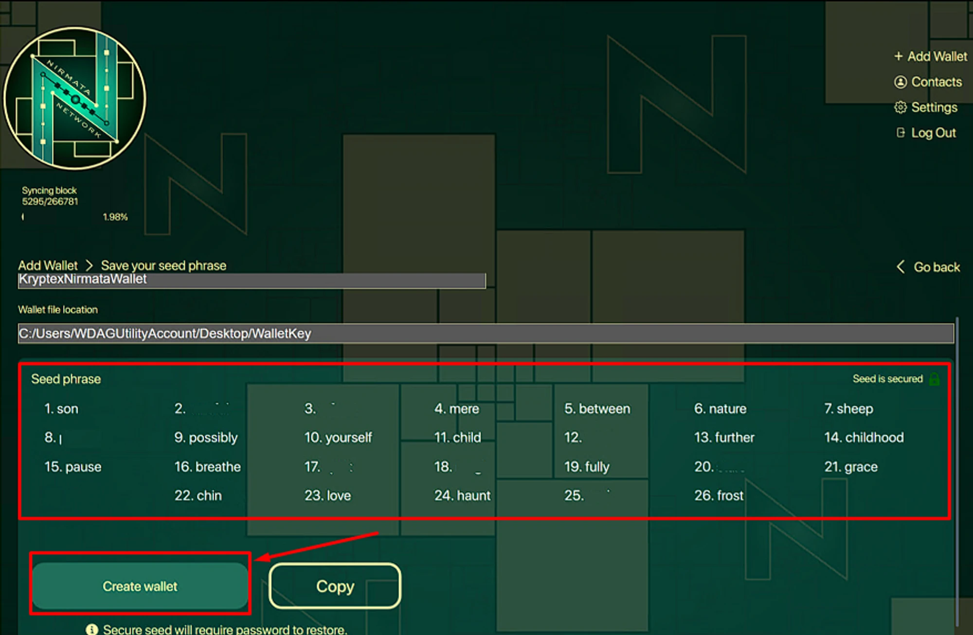 You will receive a secret phrase consisting of 26 words. It is crucial to securely store these words in the same order as they appear on your screen since losing them means losing access to your wallet! You can copy this combination by clicking the button “Copy”. Next, click "Create wallet".