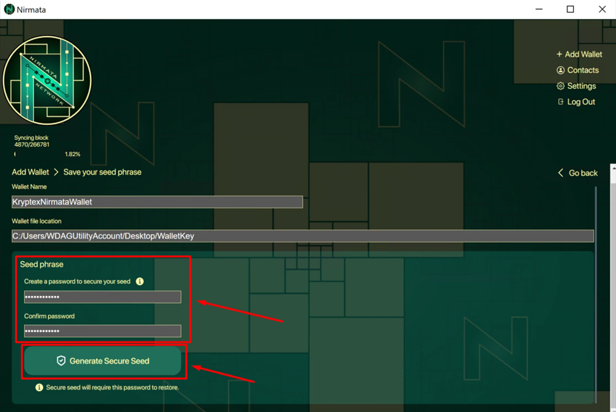 Create security password to access the Seed-phrase → confirm password → click "Generate Secure Seed";