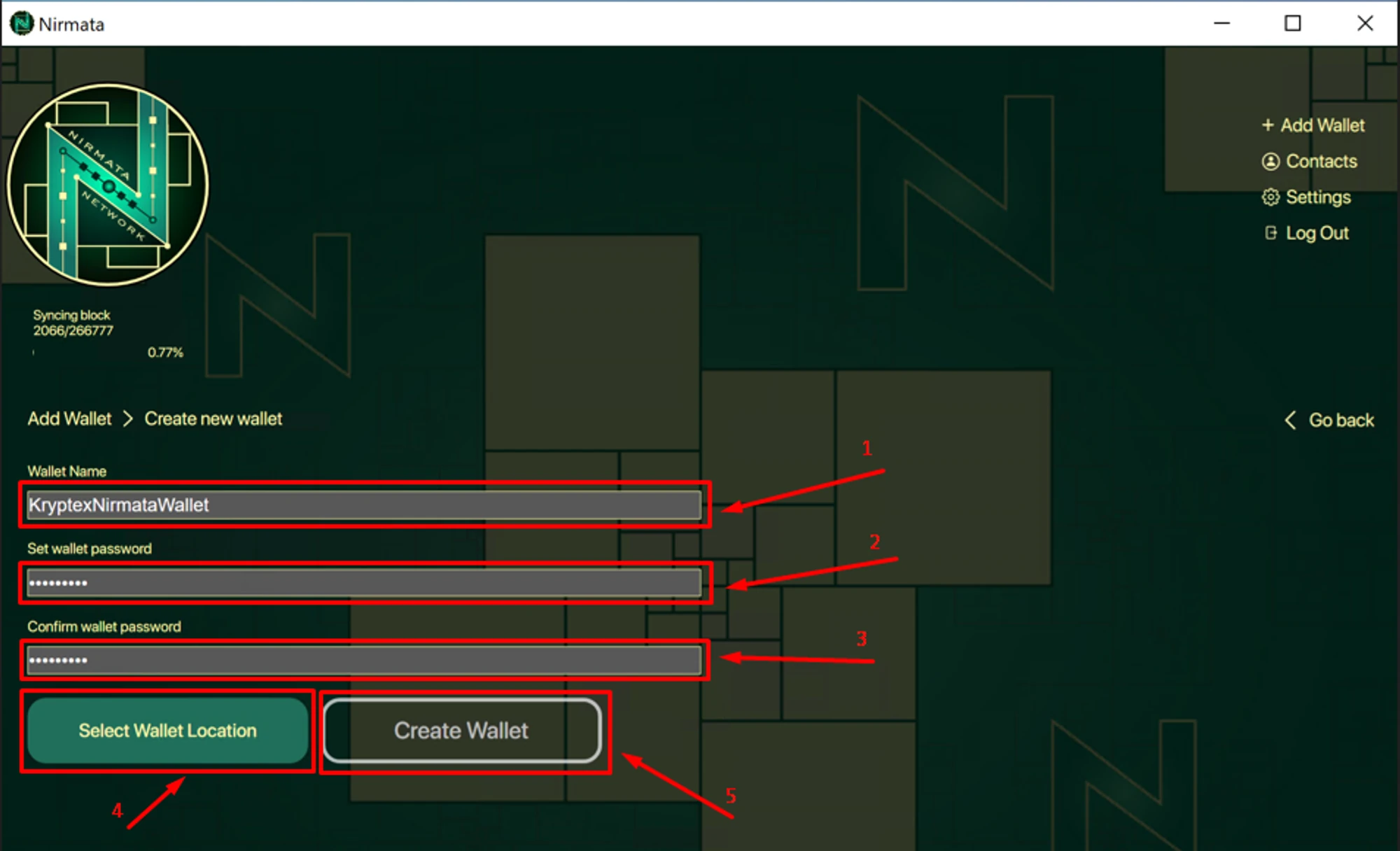 Create a name for your wallet → specify password to access the wallet → confirm password to access the wallet → click "Select Wallet Location" and select the folder to create the wallet → then click "Create Wallet";