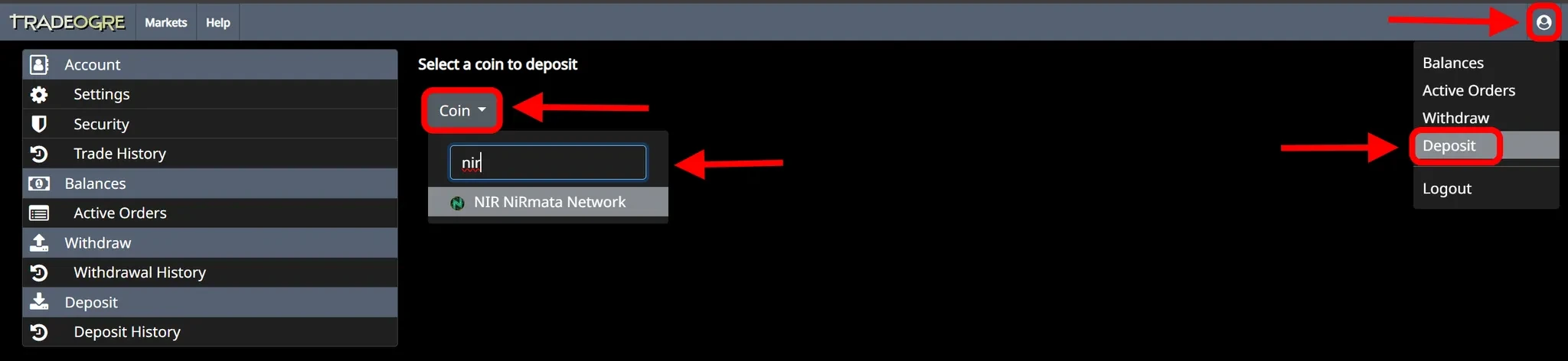 After registering, open your account and click “Deposit” → then open the “Coin” dropdown menu → select “NIR” from the list.
