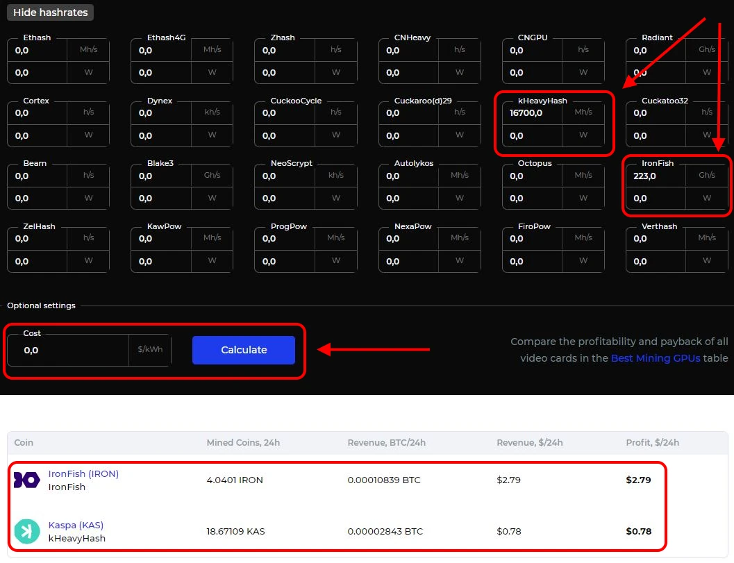 | Model | Coin | Hashrate | Consumption | Profit w/o El. Price |