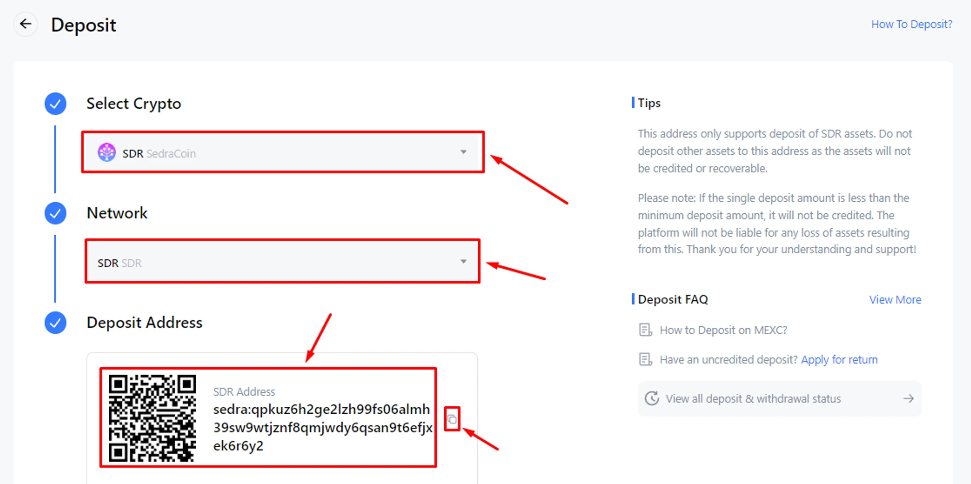 Select "Select Crypto → SDR", "Network → SDR", get "Deposit Address";