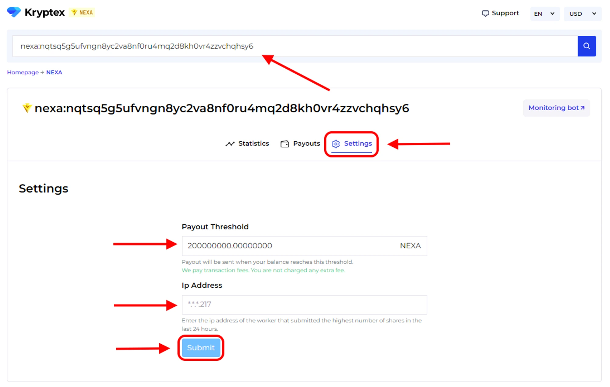 Set the desired “Payment Threshold”. Minimum and maximum payment threshold mentioned at the pool home page. There is no payout fee — Kryptex pays it for you 🖤