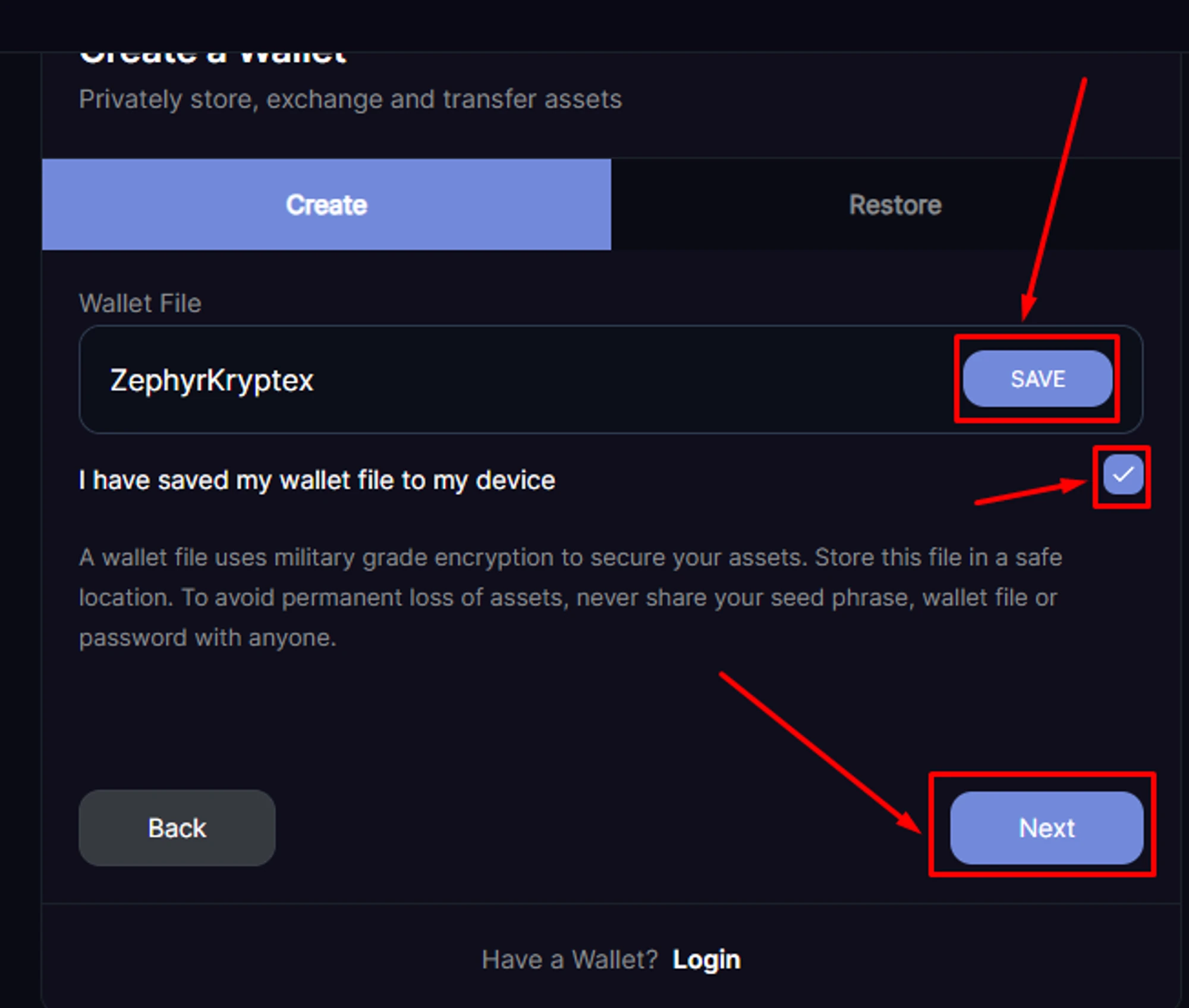 将钱包访问密钥保存在您的设备上 — 点击“保存”;