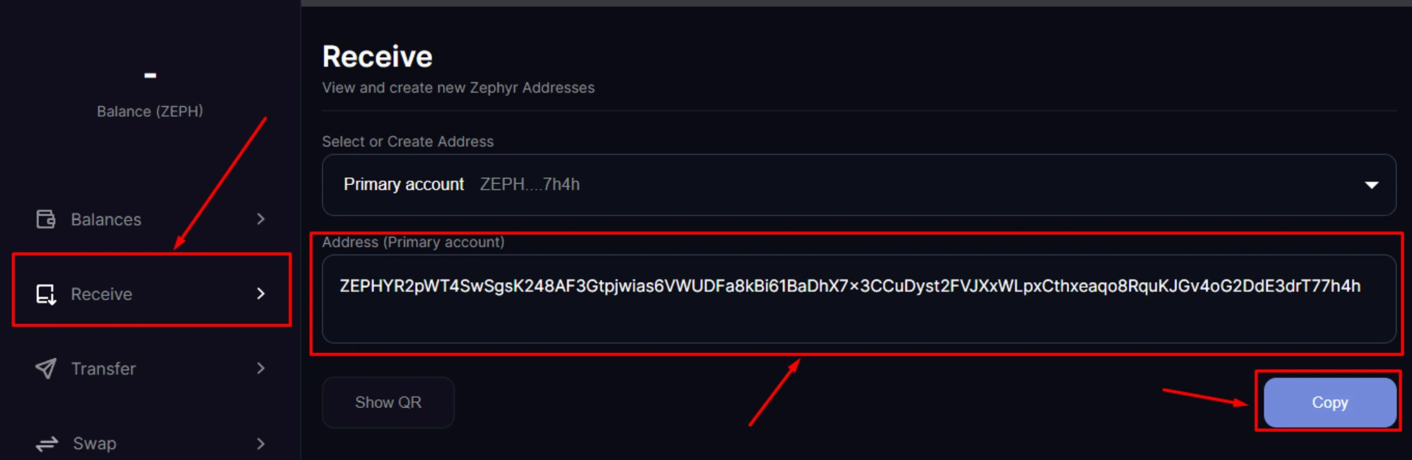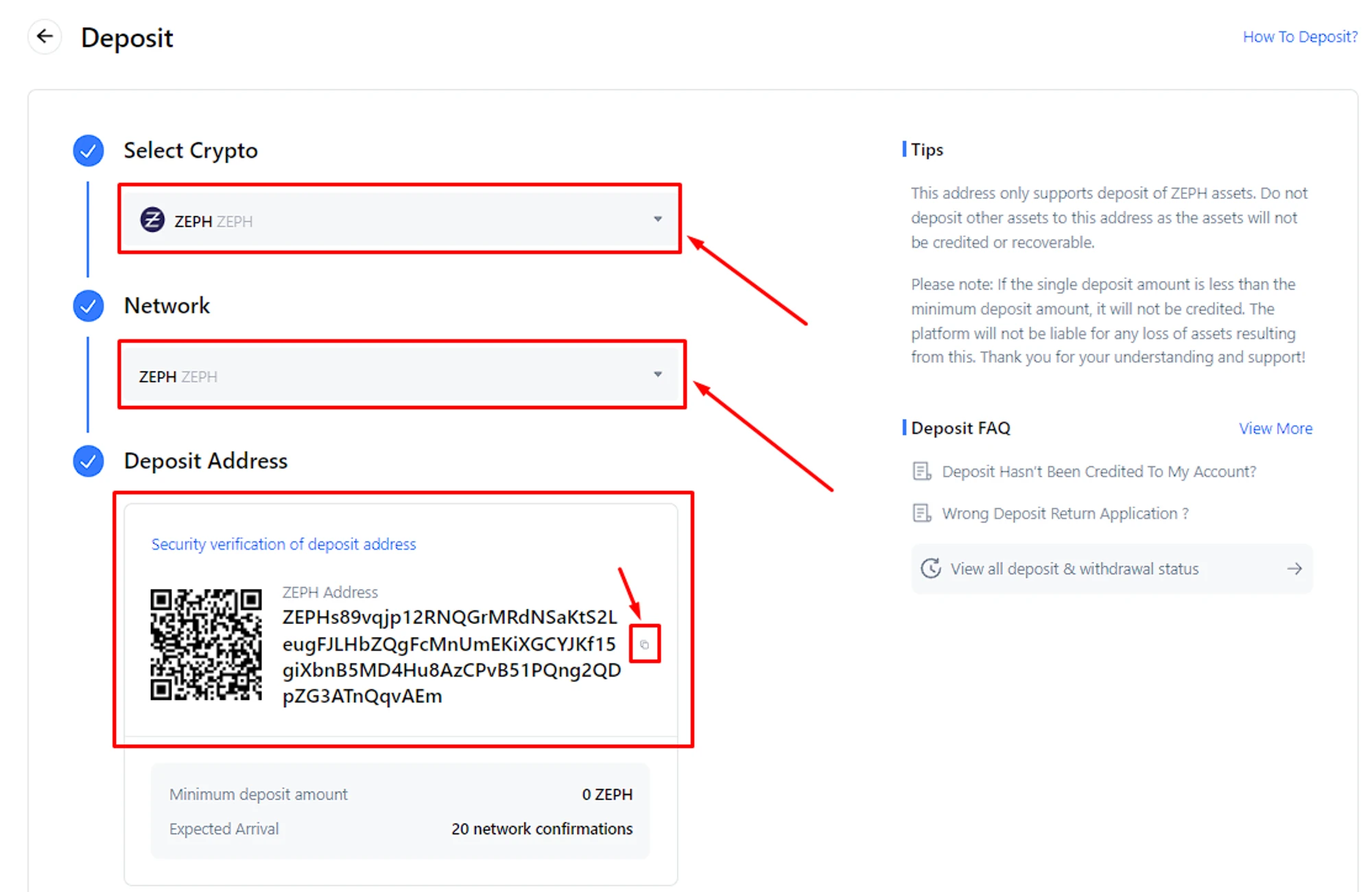 选择“选择加密货币 → ZEPH”,“网络 → ZEPH”,获取“存款地址”;