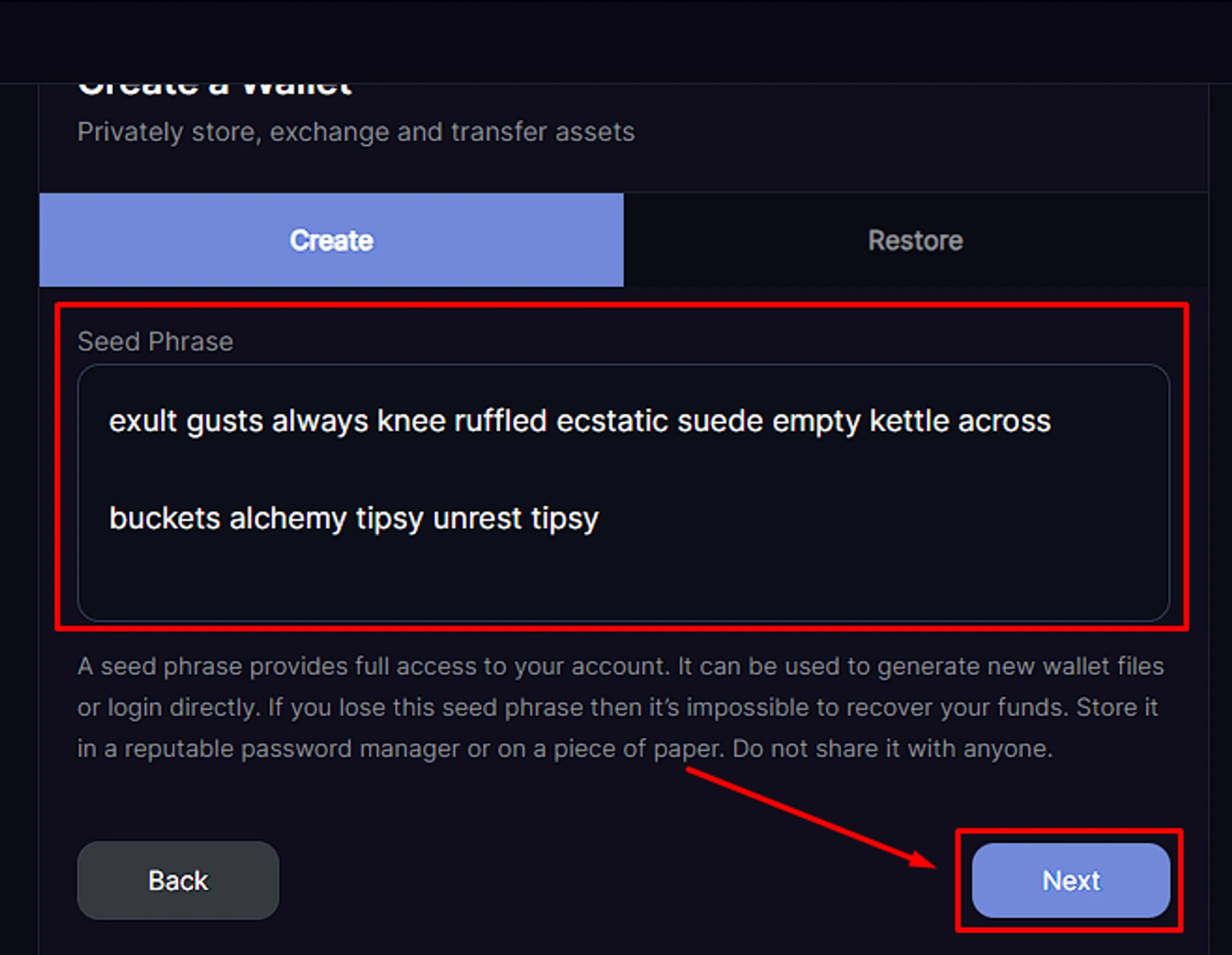 您将收到一个秘密短语 — 由 25 个单词组成。请按屏幕上显示的顺序安全保存它们。丢失它们意味着失去对您钱包的访问! 然后点击“下一步”。