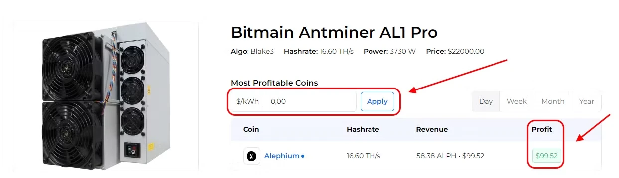 Actualmente, la rentabilidad diaria de Bitmain Antminer AL1 es de aproximadamente ~93,5$, y la de Bitmain Antminer AL1 Pro es de aproximadamente ~99,5$ sin incluir los costos de electricidad.