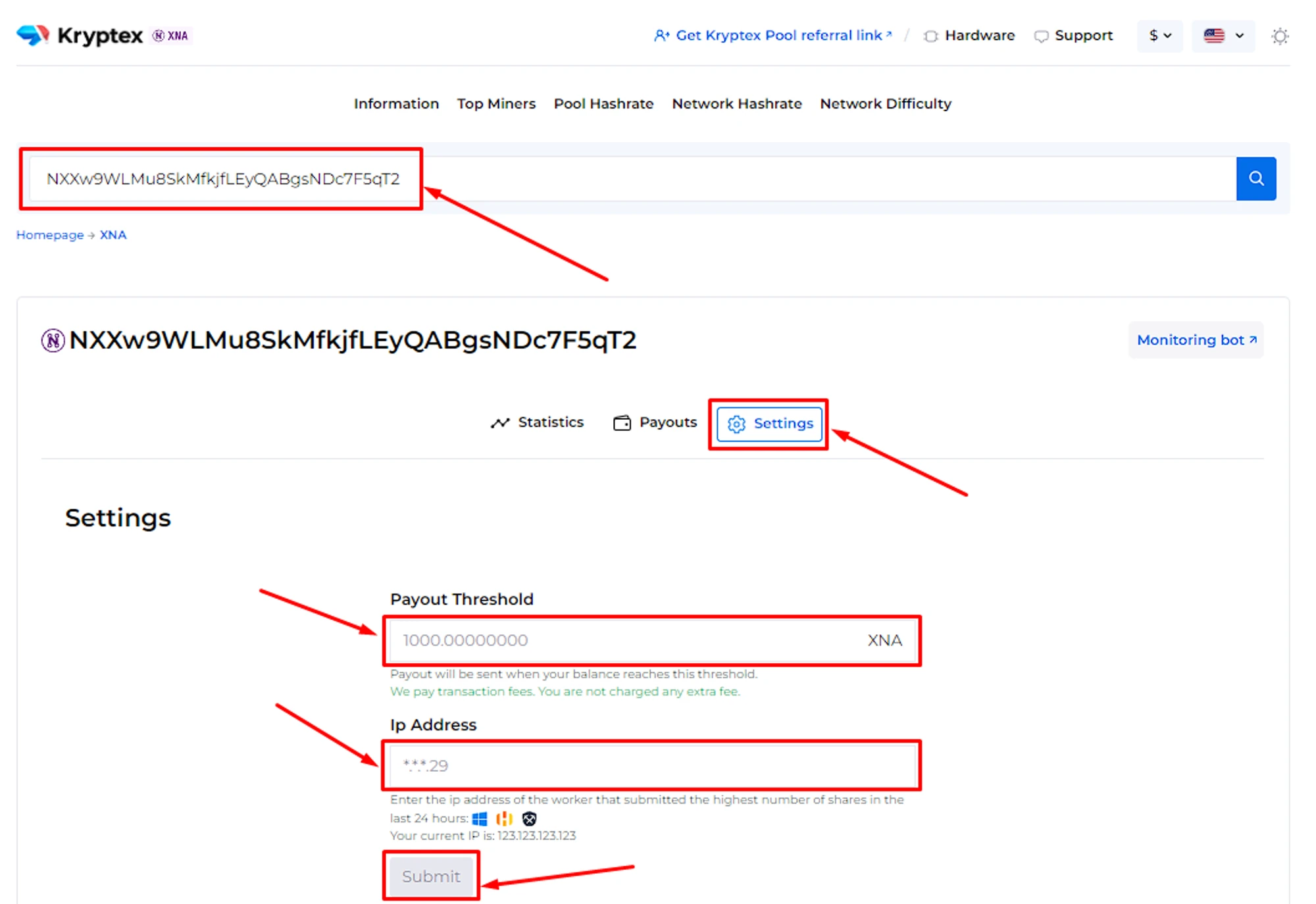 Set the desired “Payment Threshold”. Minimum and maximum payment threshold mentioned at the pool home page. There is no payout fee — Kryptex pays it for you 🖤