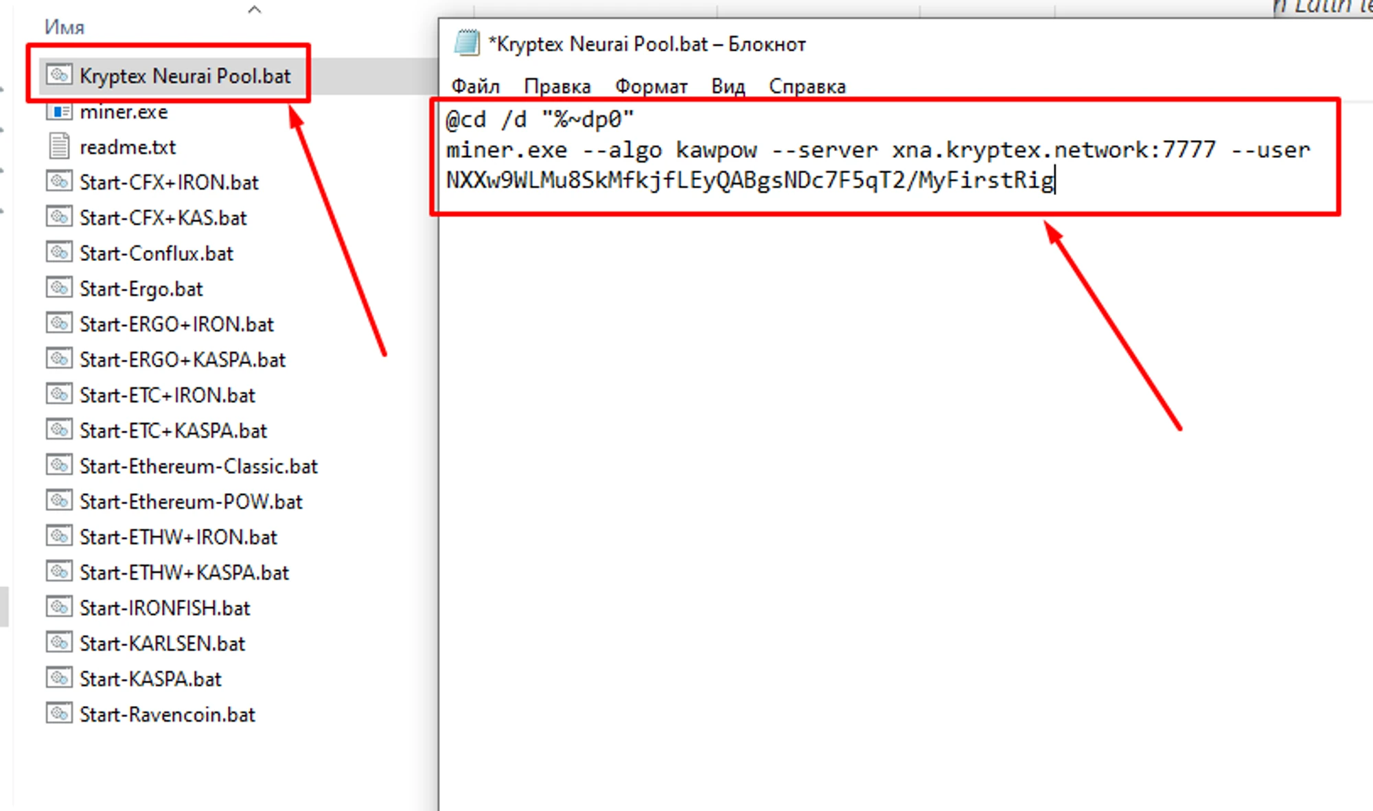 .txtwith the Notepad application. Let's call itKryptex Neurai Pool. Then, open the file, and paste the copied sample BAT file into the document.