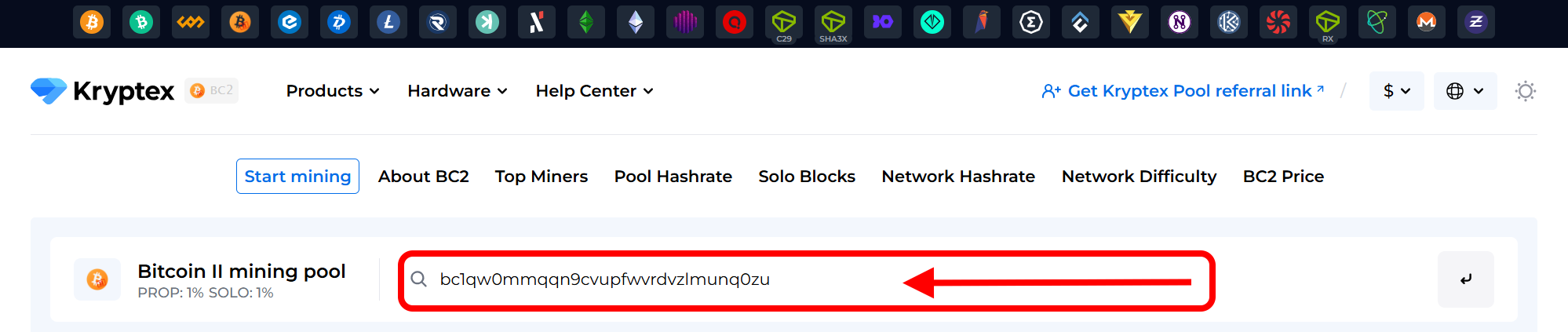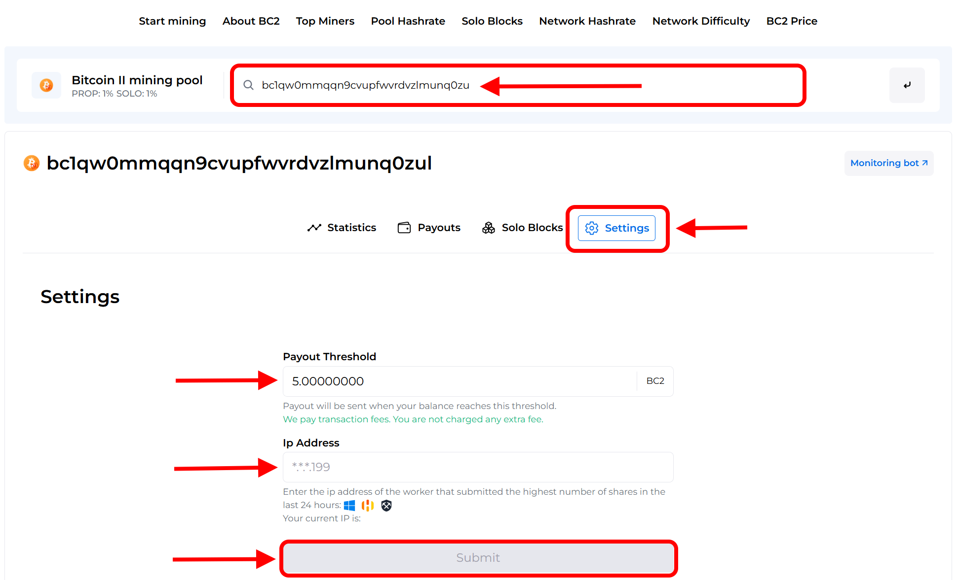 Open the Bitcoin II BC2 pool page and enter your mining address;