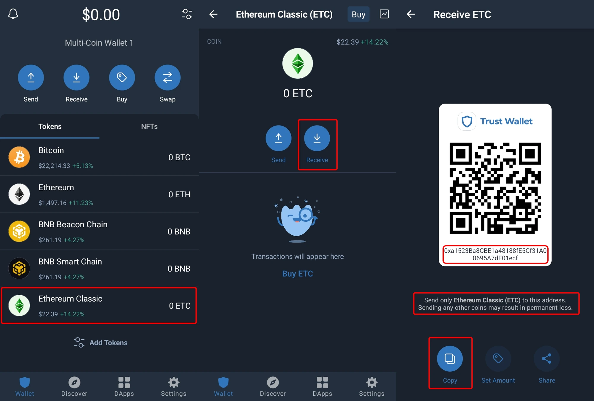 Pronto! Sua carteira ETC está pronta para uso. Clique nela na lista de moedas, pressione "Receber", e você verá o endereço da sua carteira.
