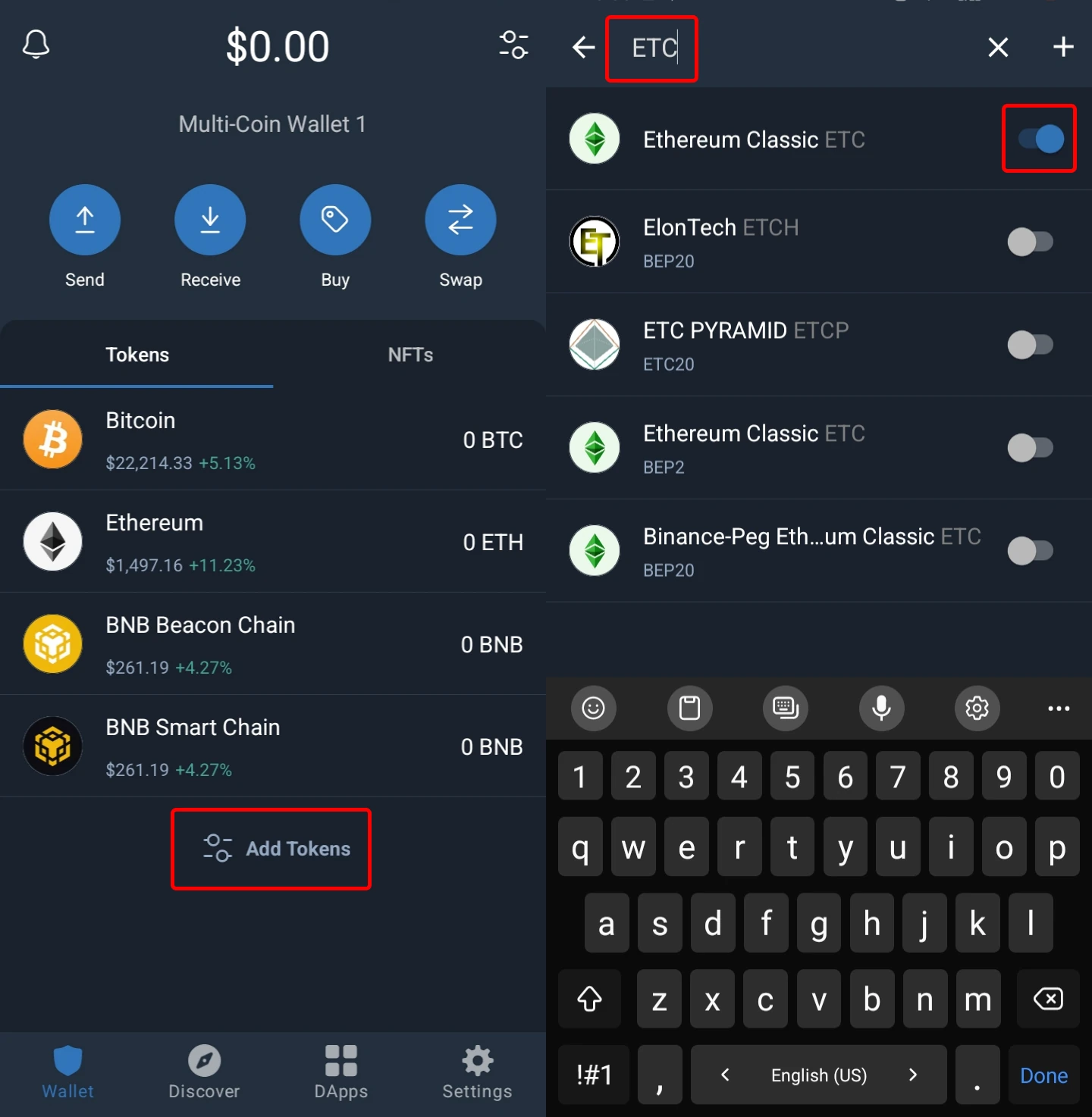 Algumas moedas estão disponíveis por padrão. Você pode usá-las, remover as desnecessárias ou adicionar as necessárias. Vamos adicionar ETC. Clique em "Adicionar Tokens"; digite "ETC" na barra de pesquisa; clique no interruptor para adicionar uma moeda. Volte ao menu anterior.