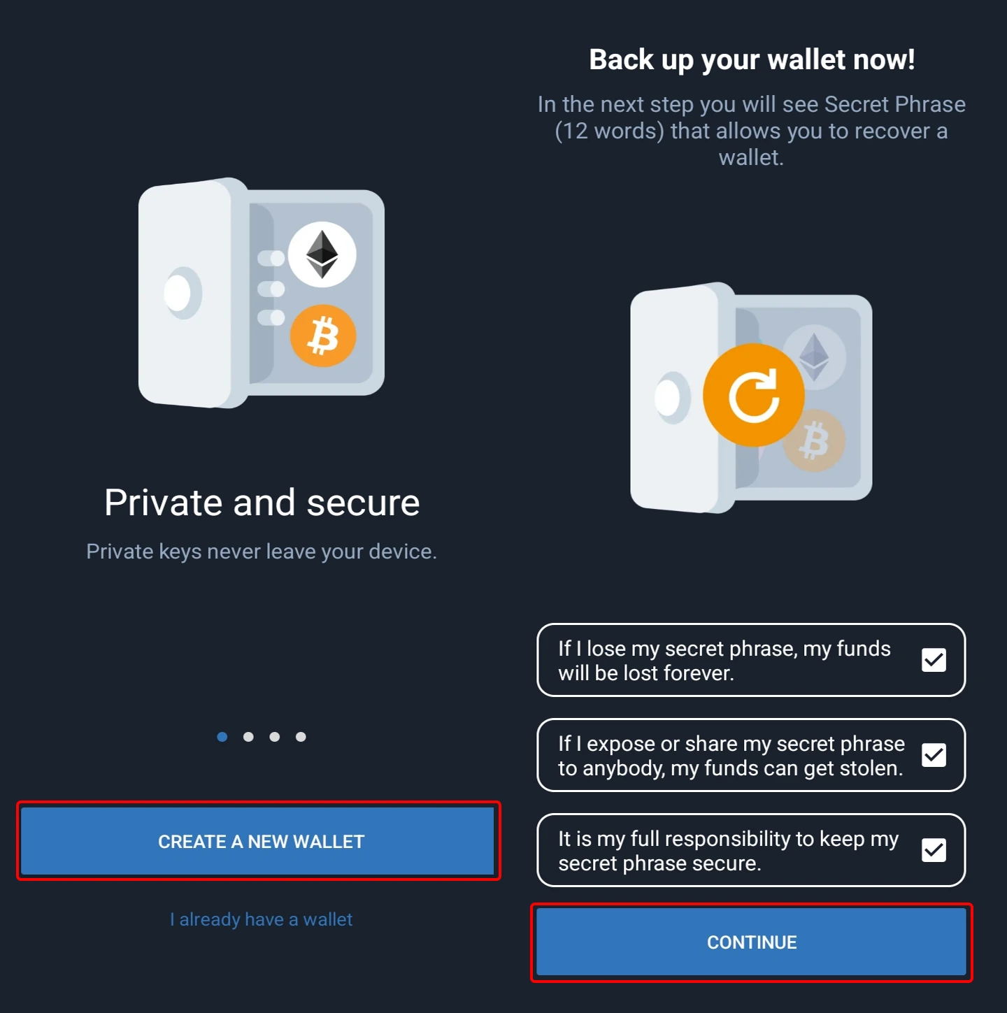 Inicie-o, clique em "Criar uma nova carteira”, insira um código PIN e aceite os termos e condições da carteira. Lembre-se — você é o único responsável pela segurança da sua carteira! Você receberá uma frase secreta — uma combinação de 12 palavras. Guarde-as com segurança na mesma ordem em que aparecem na tela do seu telefone. Perdê-las significa perder o acesso à sua carteira!