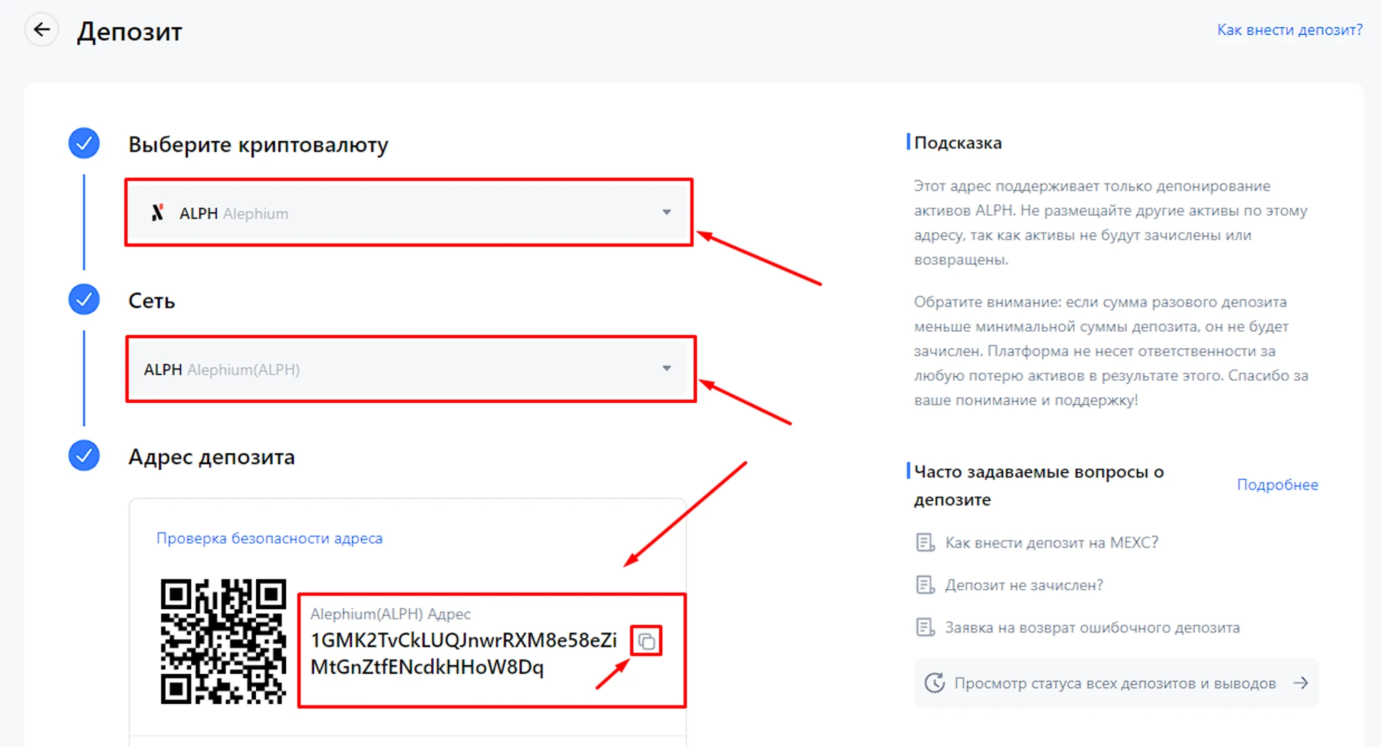 Откроется страница депозитов, выберите “Выберите криптовалюту → ALPH”, “Сеть → ALPH”, получите “Адрес депозита”;