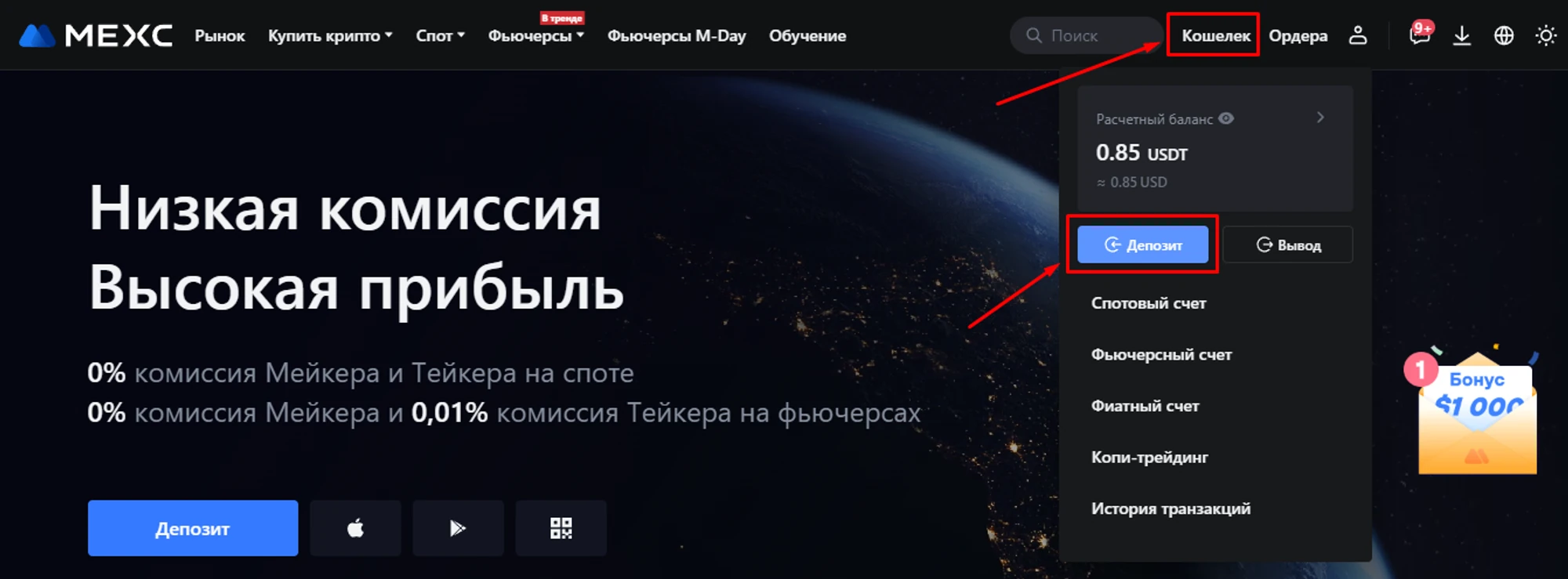 После регистрации выберите “Кошелёк”, затем “Депозит”;