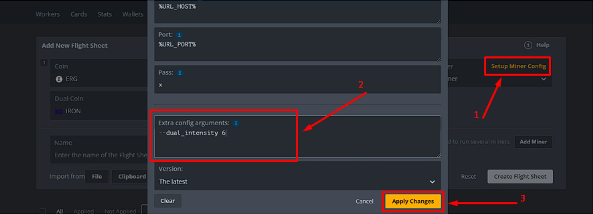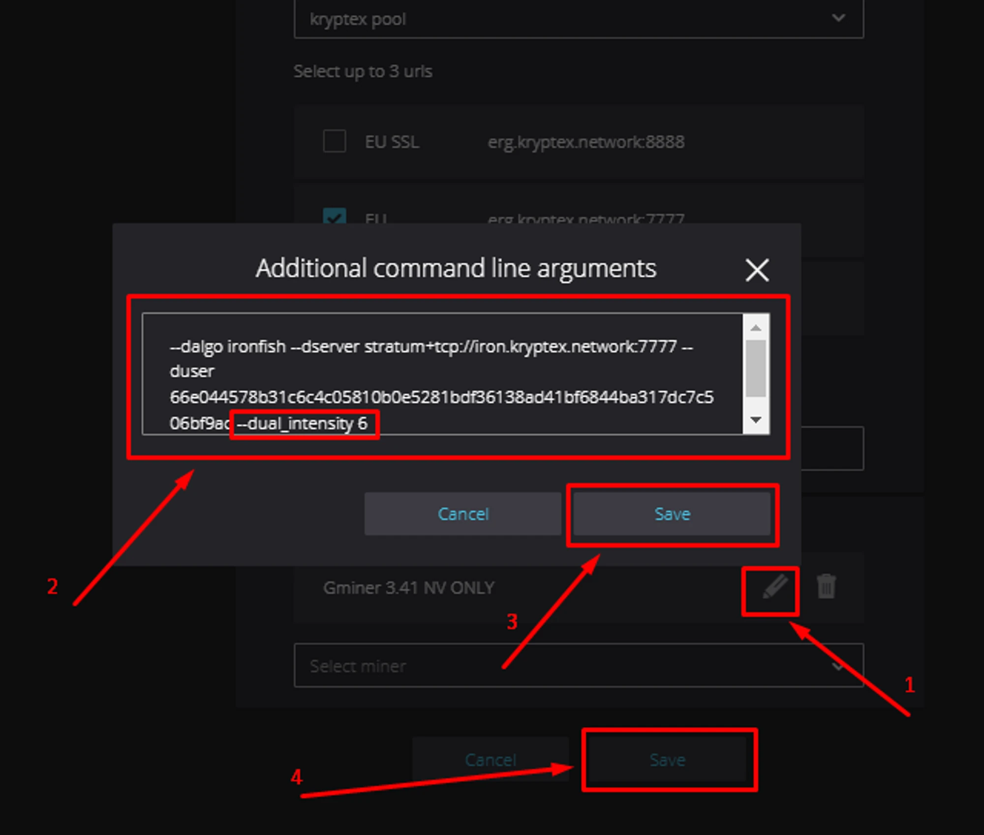 --dual_intensityargument with the required value in the "Additional command line arguments" field;Save your changes → Click "Save" in the arguments field → Click "Save" to save the miner.