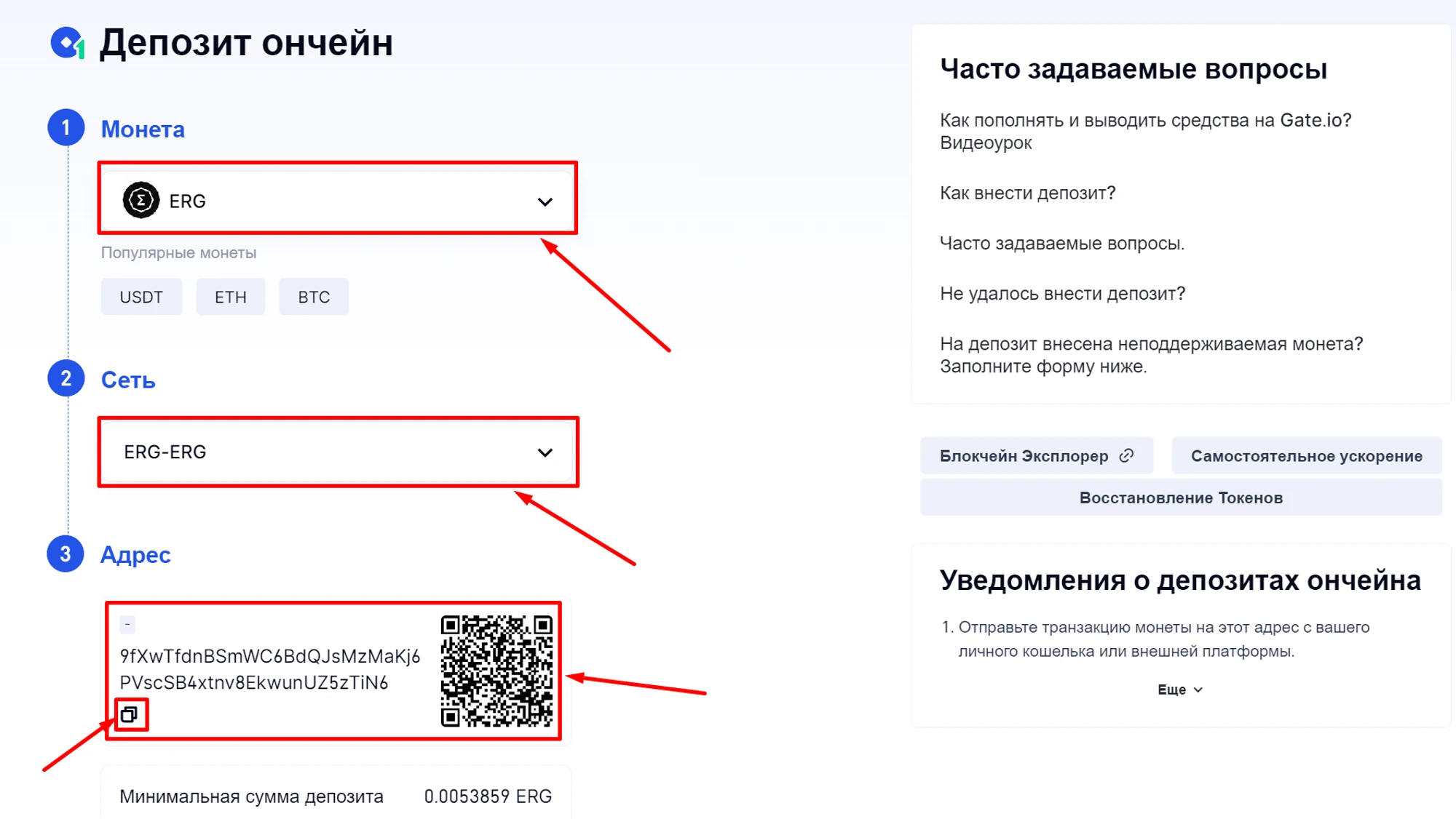 Откроется страница депозитов, выберите “Монета → ERG”, “Сеть → ERG-ERG”, получите “Адрес”;