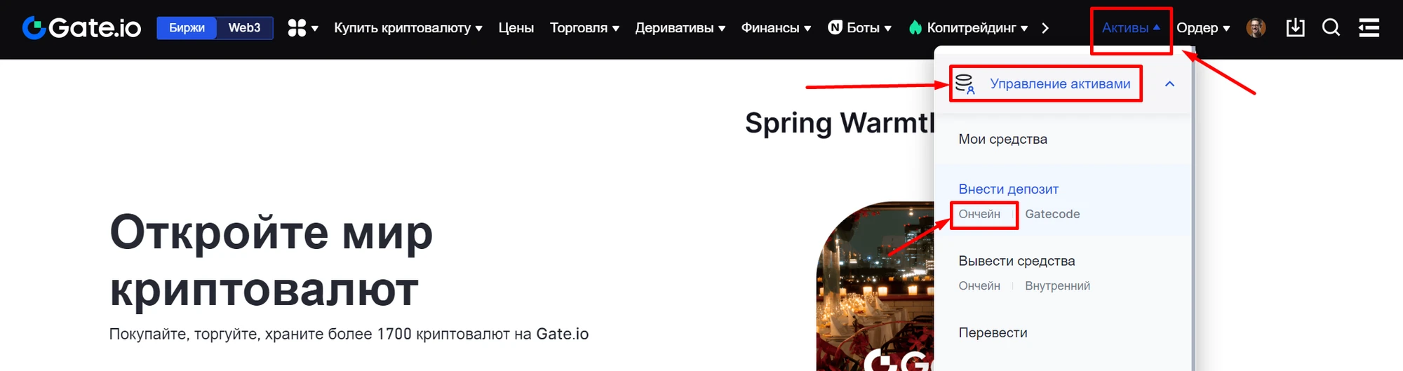 После регистрации, выберите “Активы” → “Управление активами” → “Внести депозит” → “Ончейн”;