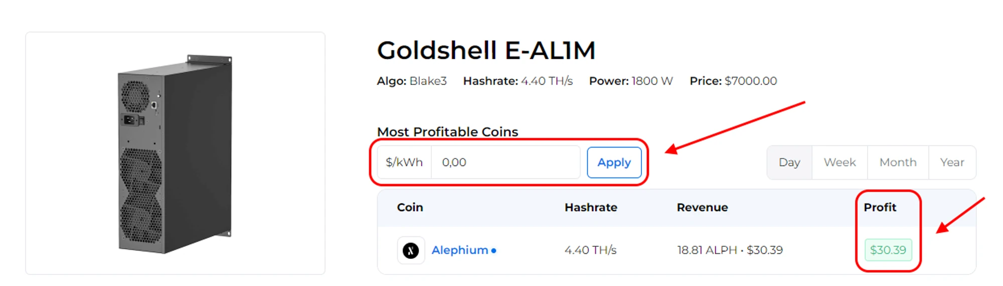 Посчитать доходность АСИКа Goldshell E-AL1M на калькуляторе майнинга.