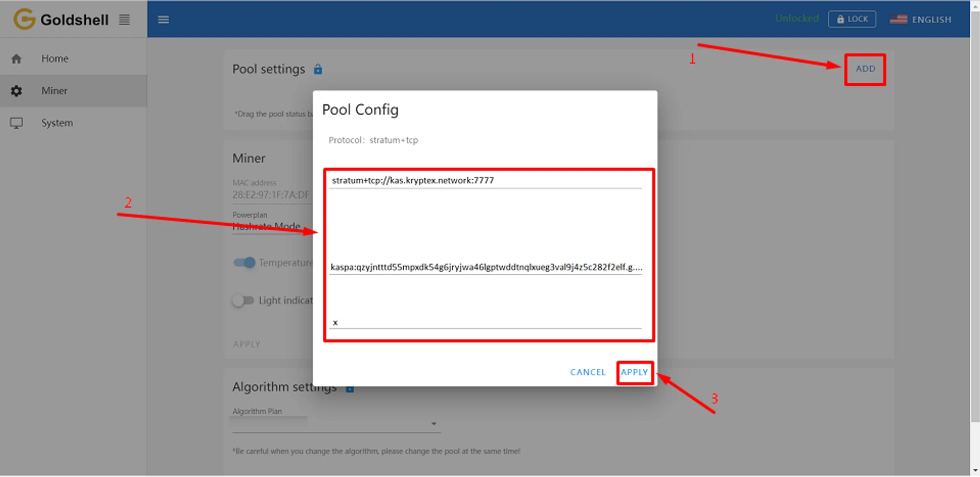 kaspa:qzyjntttd55mpxdk54g6jryjwa46lgptwddtnqlxueg3val9j4z5c282f2elf— your wallet address, starting withkaspa:goldshell— Your ASIC name.