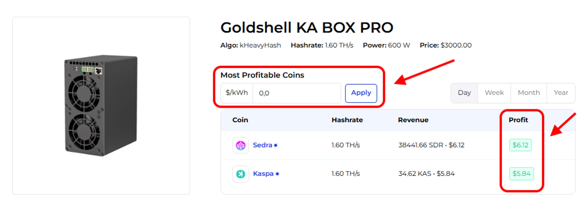 Currently, the daily profitability of Goldshell KA BOX is about ~ 4,5$, excluding electricity costs. KA BOX Pro makes ~ 6$
