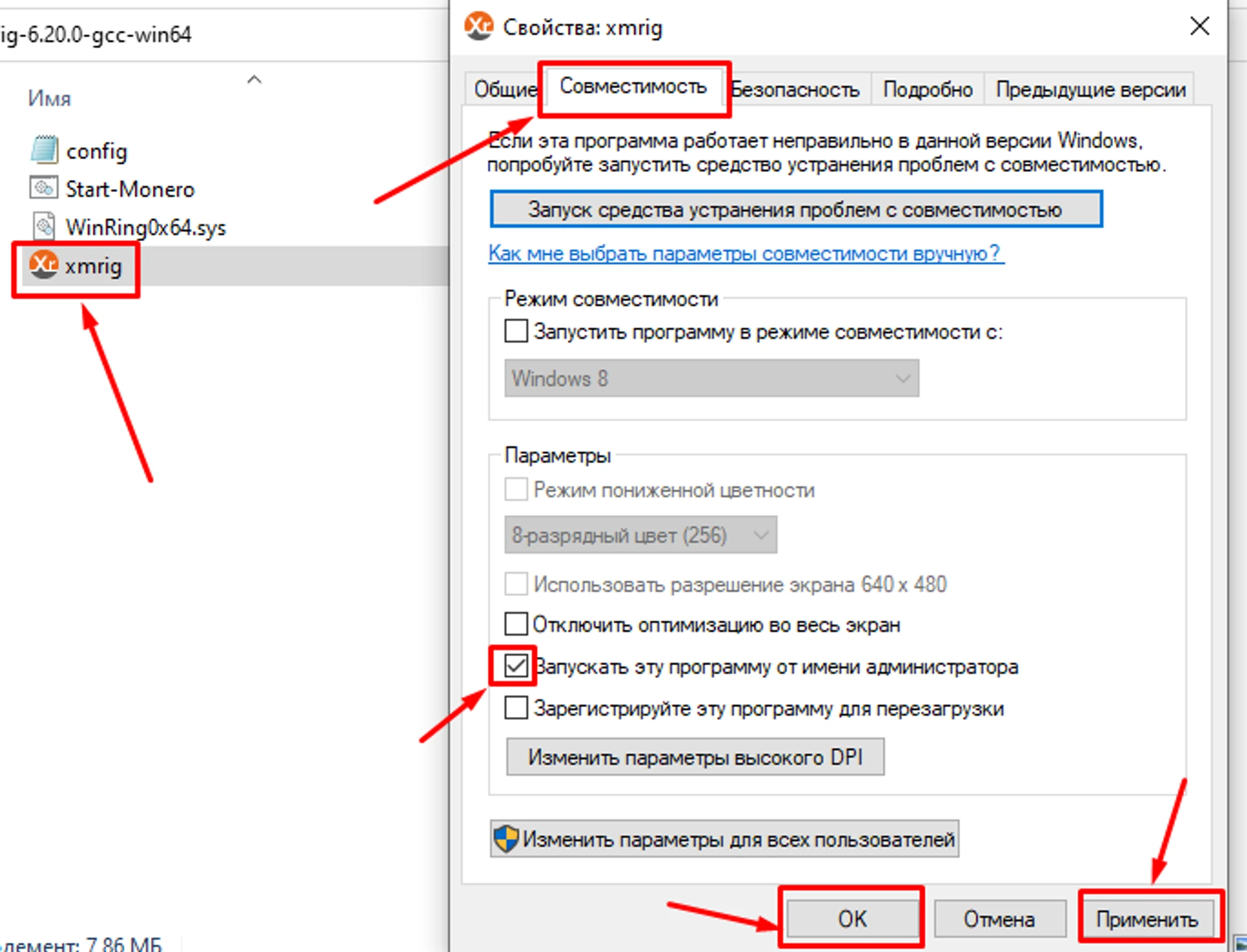 xmrig.exeВыберите “Свойства”