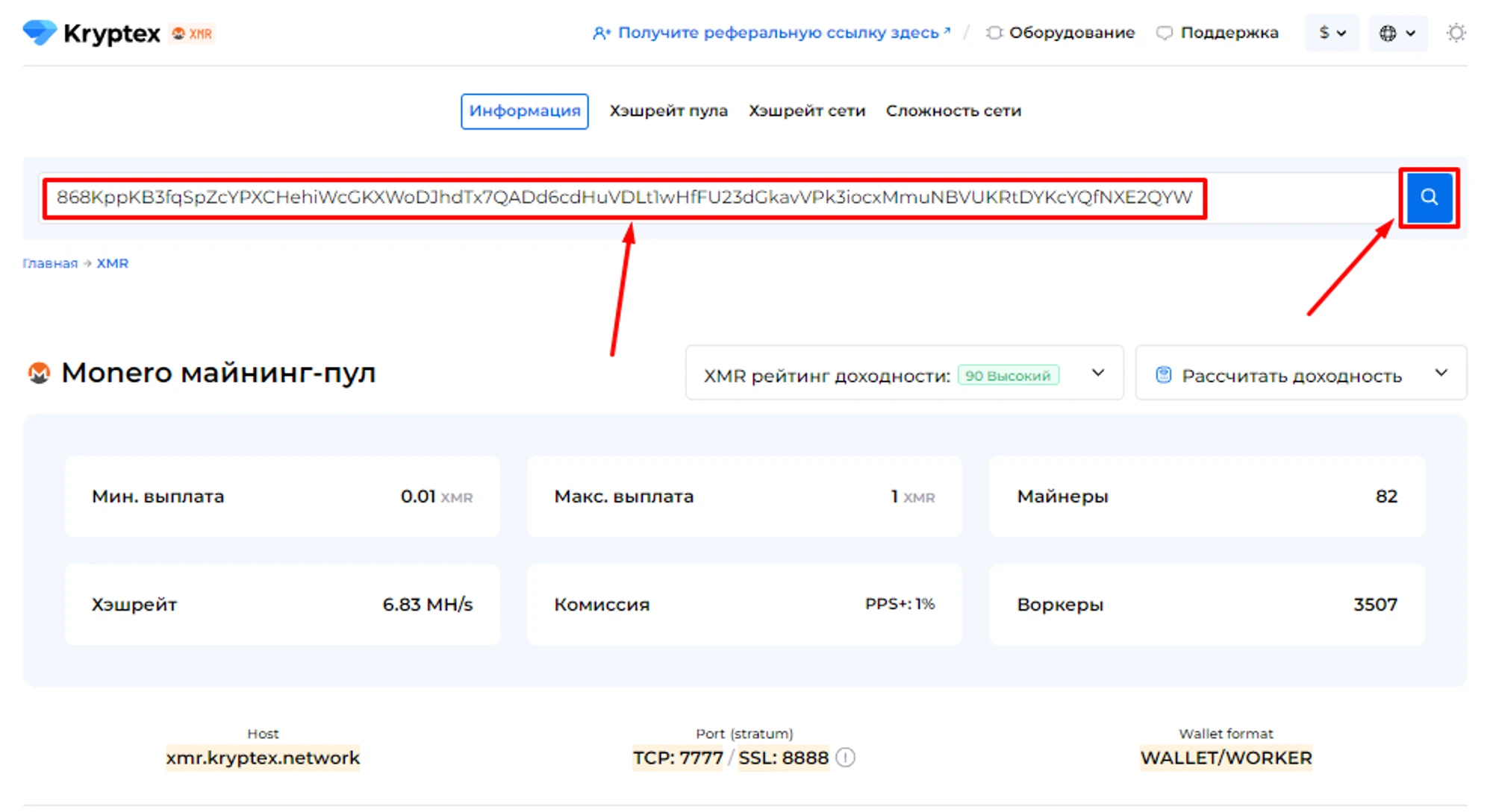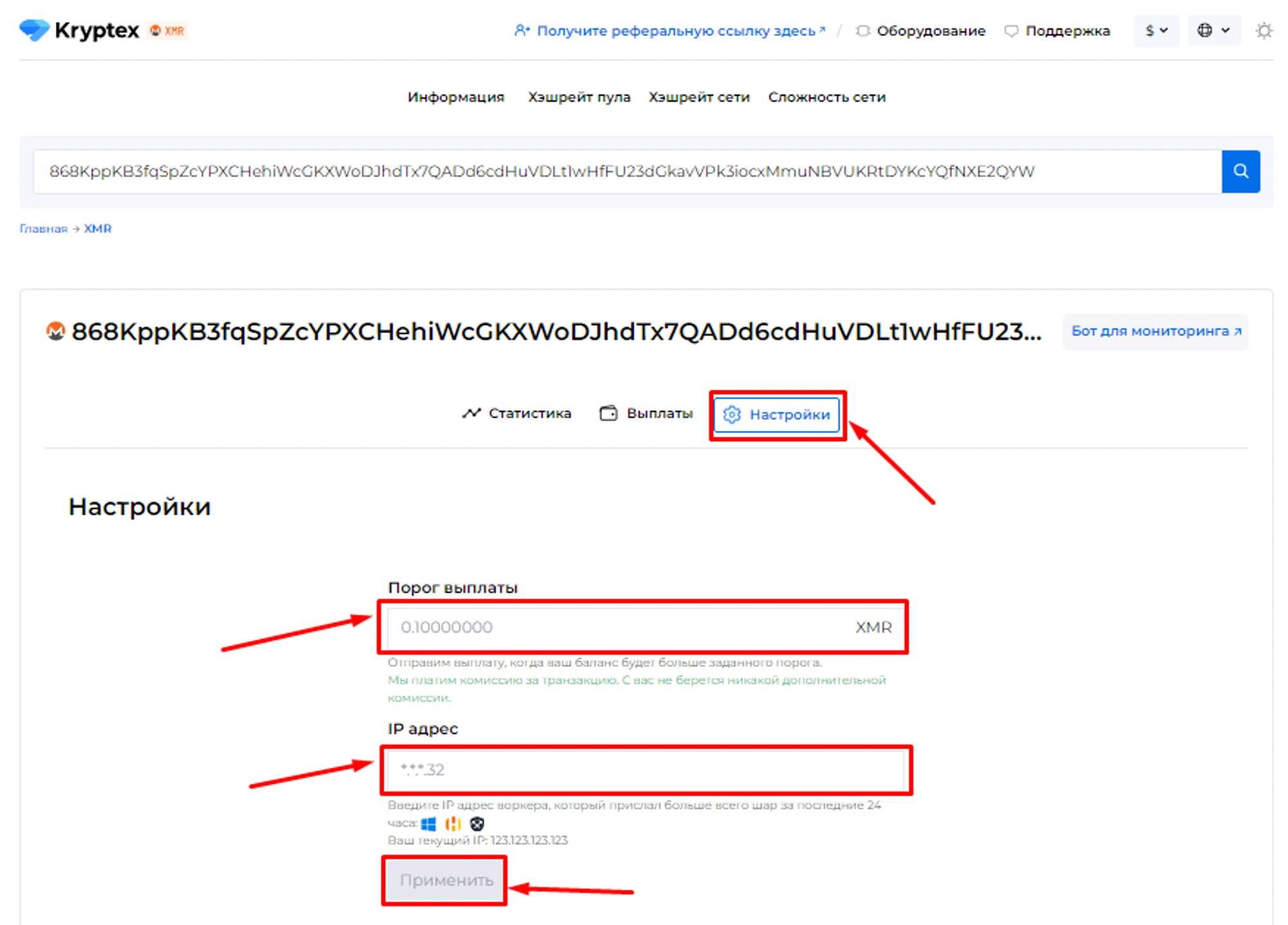 Откройте страницу с пулом и введите адрес вашего кошелька, на который вы майните;