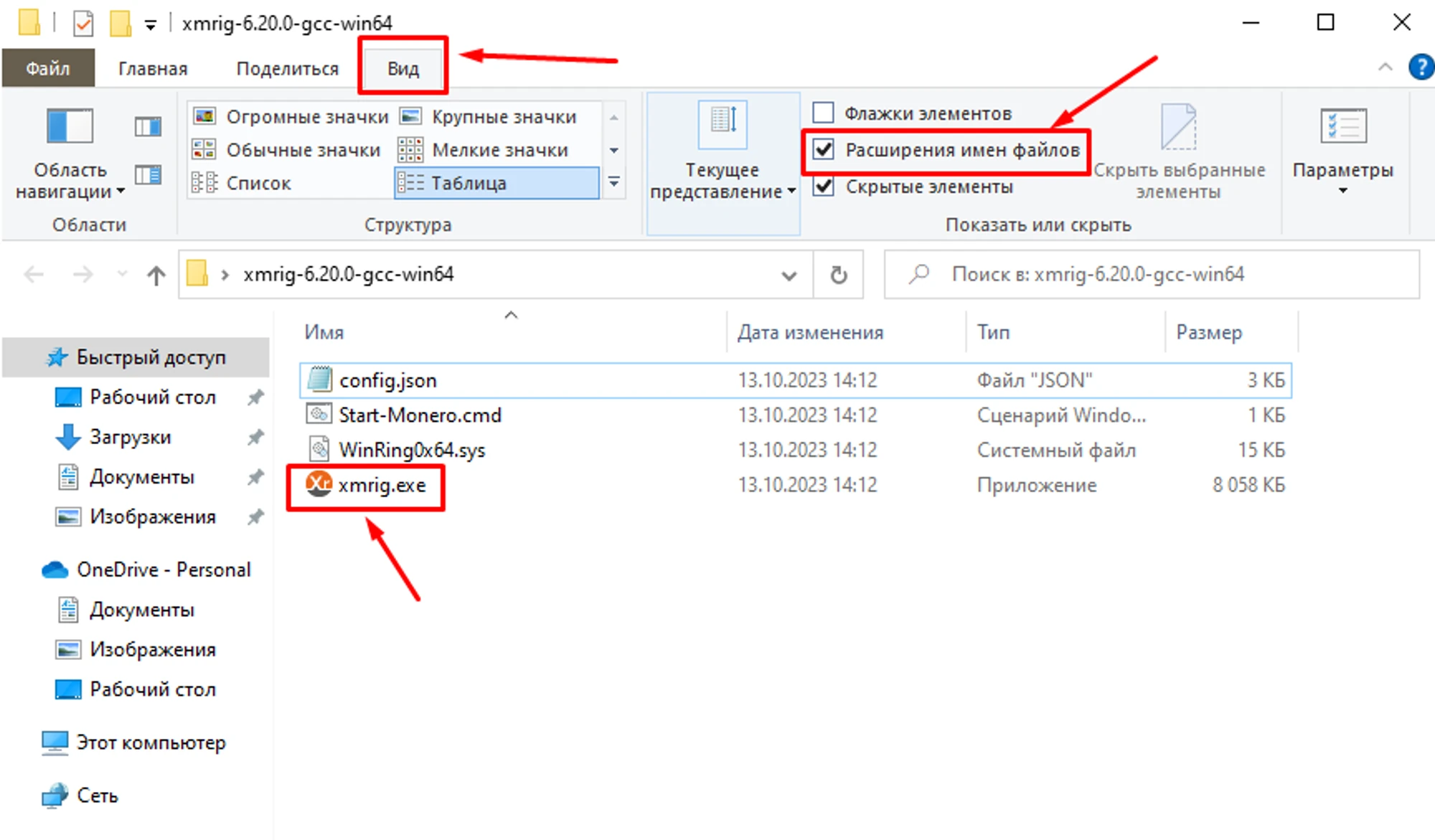 Откройте папку с майнером, включите отображение расширений файлов:
